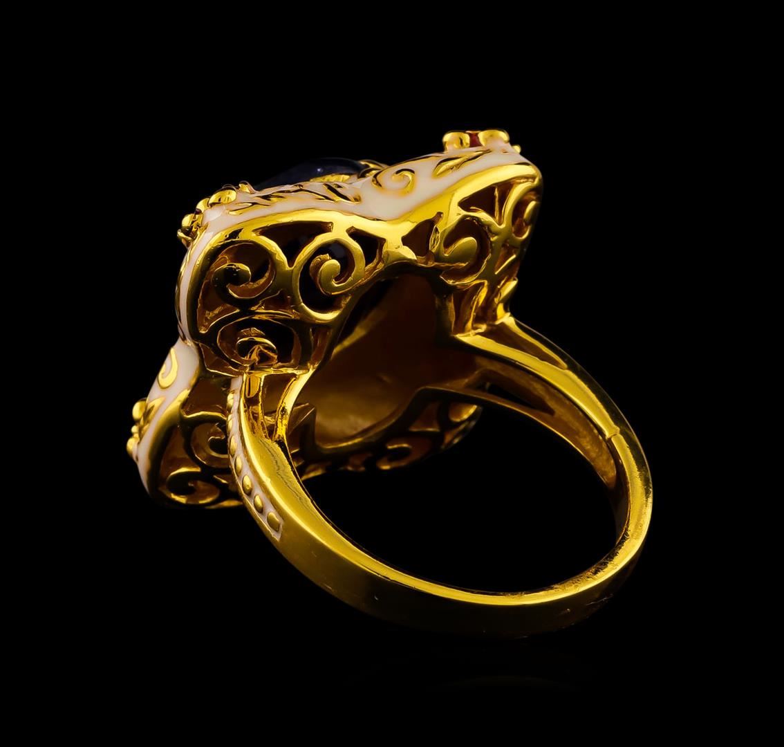One of a kind high fashion sterling silver Ring weighing 12 grams. Containing: Sapphire, White Enamel Inlay, Red Enamel Inlay. This sterling silver promises a lasting shine.