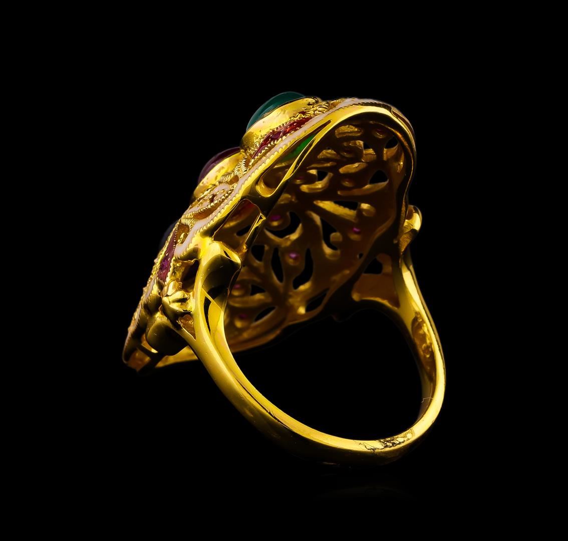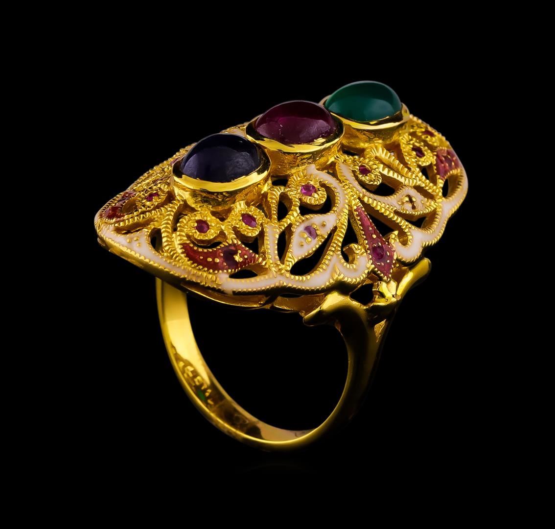 One of a kind high fashion sterling silver Ring weighing 9.2 grams. Containing: Ruby, Emerald, Sapphire, Red Enamel Inlay, White Enamel Inlay. This sterling silver promises a lasting shine.