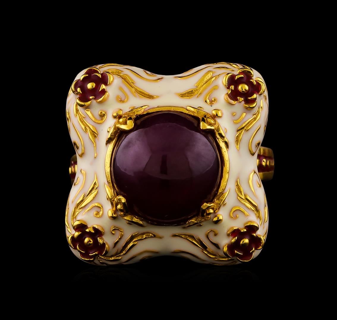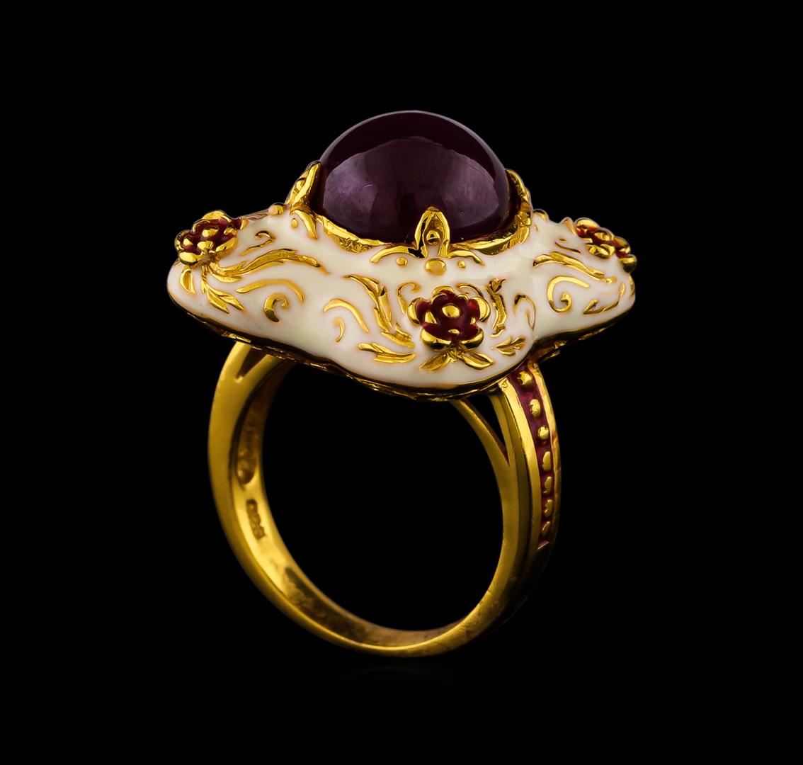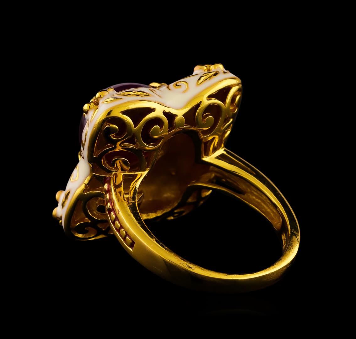 One of a kind high fashion sterling silver Ring weighing 12.6 grams. Containing: Ruby, White Enamel Inlay, Red Enamel Inlay. This sterling silver promises a lasting shine.