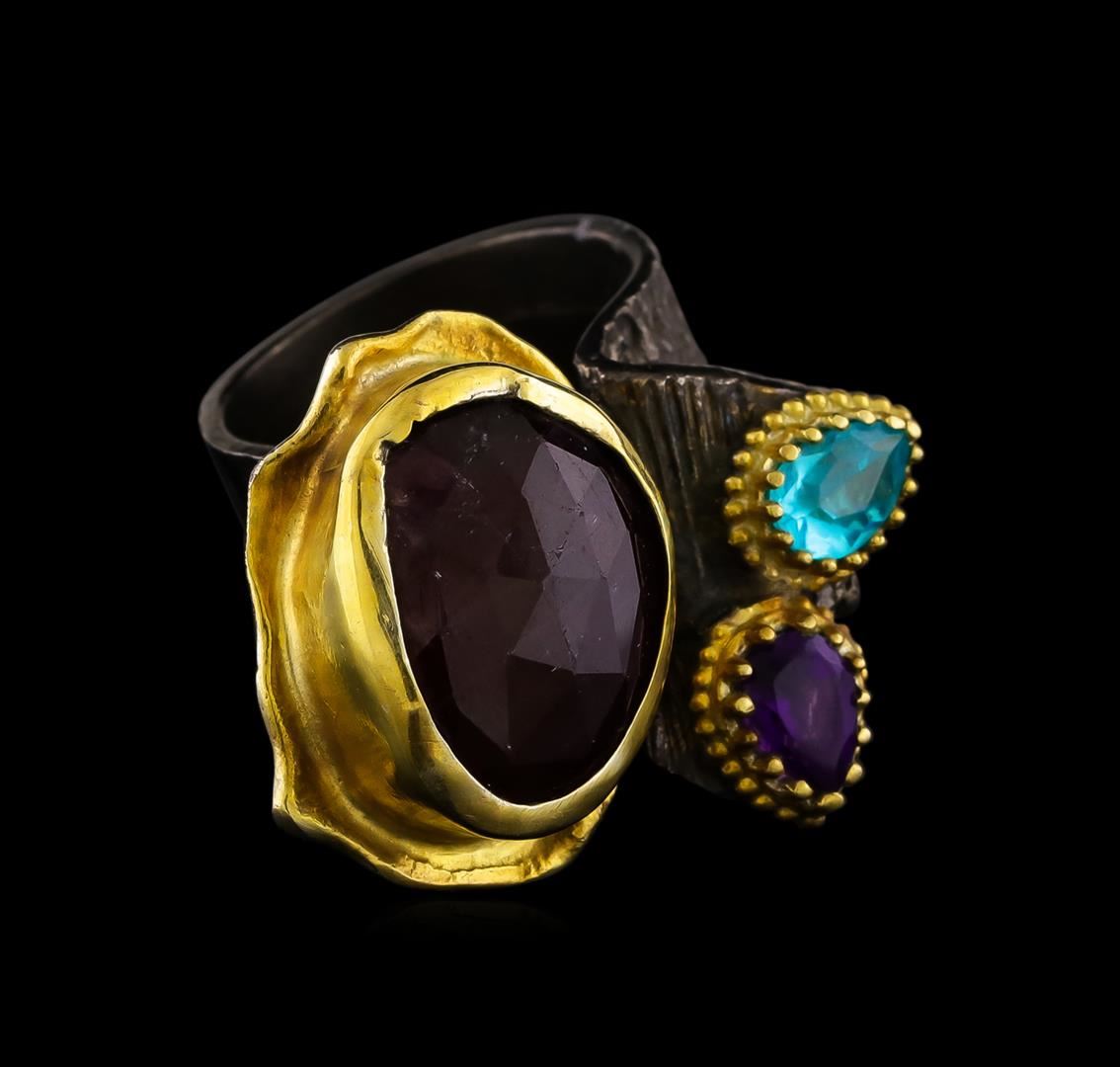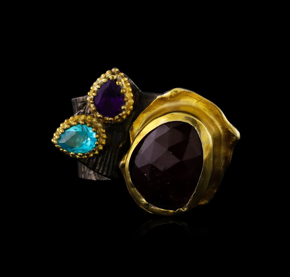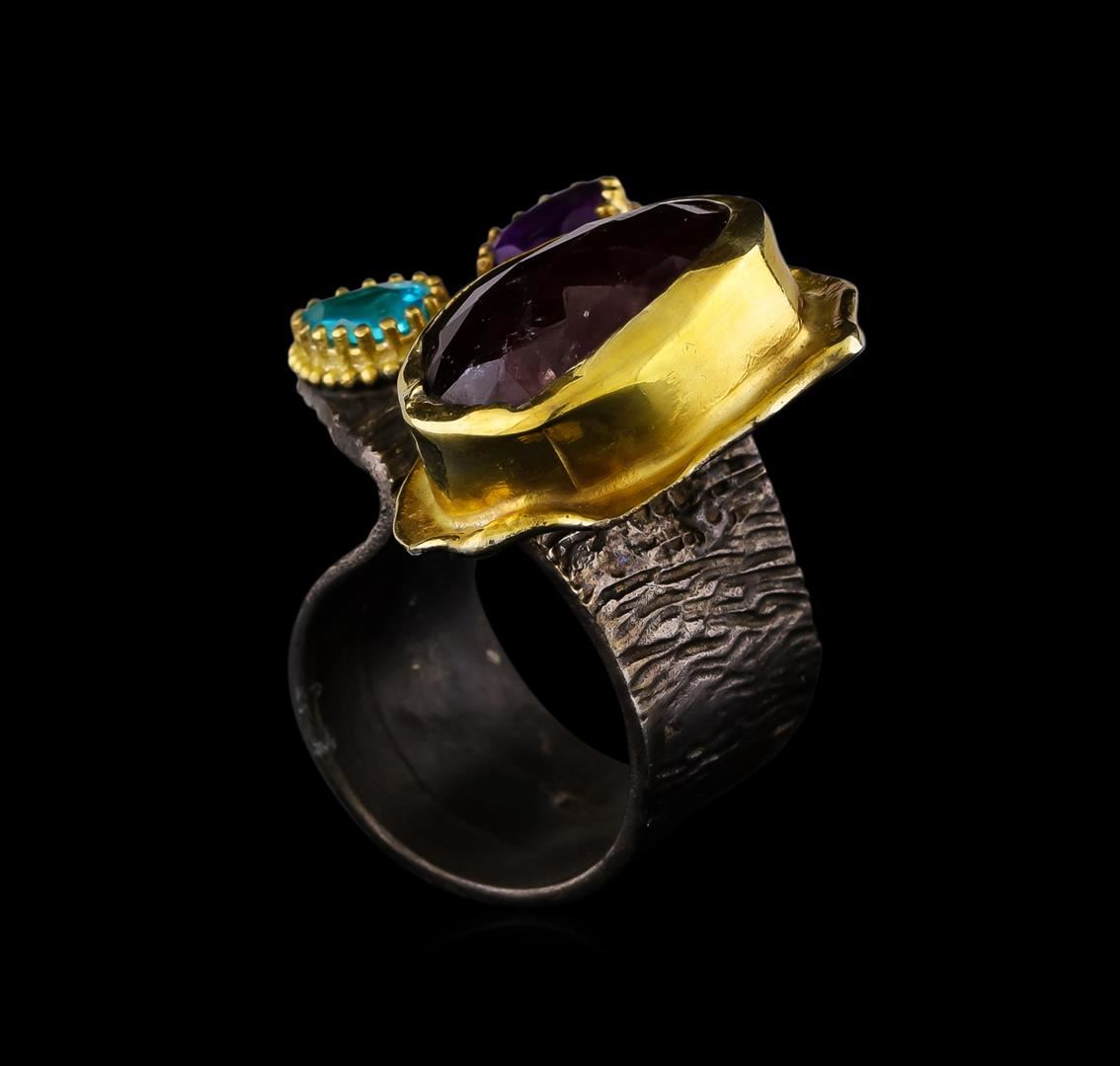 One of a kind high fashion sterling silver Ring weighing 22 grams. Black Antique texture. Containing: Ruby, Amethyst, Cyan Crystal. This sterling silver promises a lasting shine.