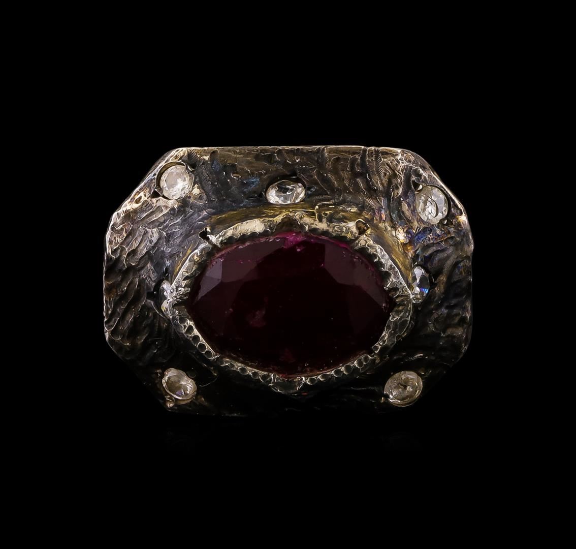 One of a kind high fashion sterling silver Ring weighing 19.7 grams. Black Antique texture. Containing: Ruby, White Crystal. This sterling silver promises a lasting shine.