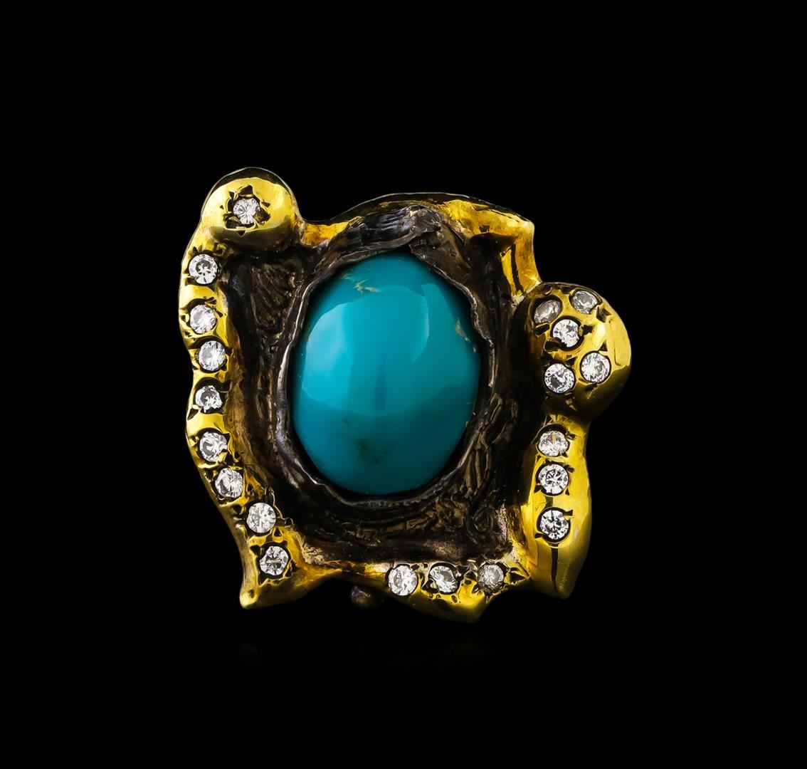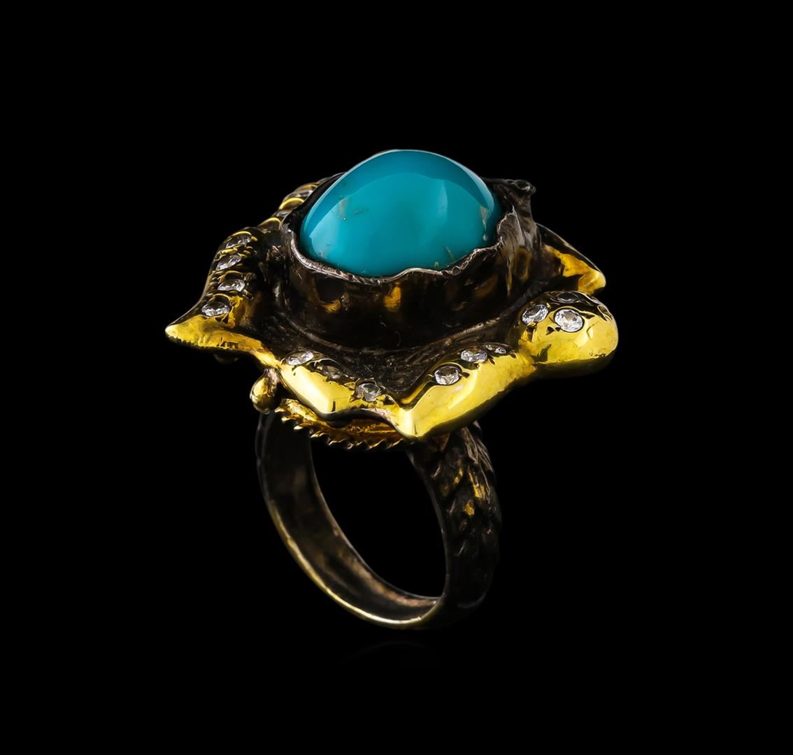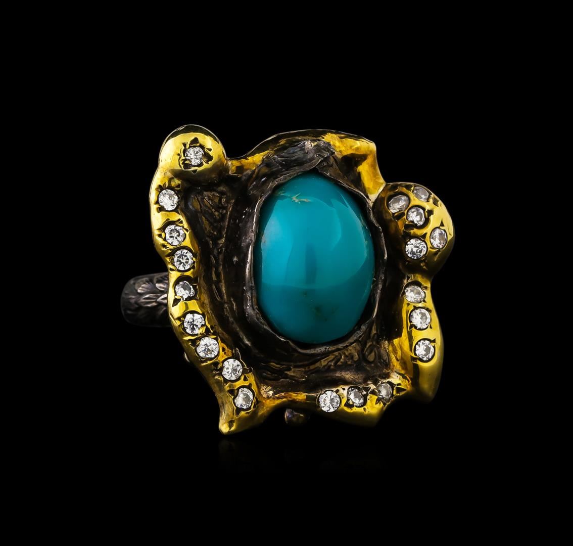 One of a kind high fashion sterling silver Ring weighing 18.8 grams. Black Antique texture. Containing: Created Turquoise, White Crystal. This sterling silver promises a lasting shine.