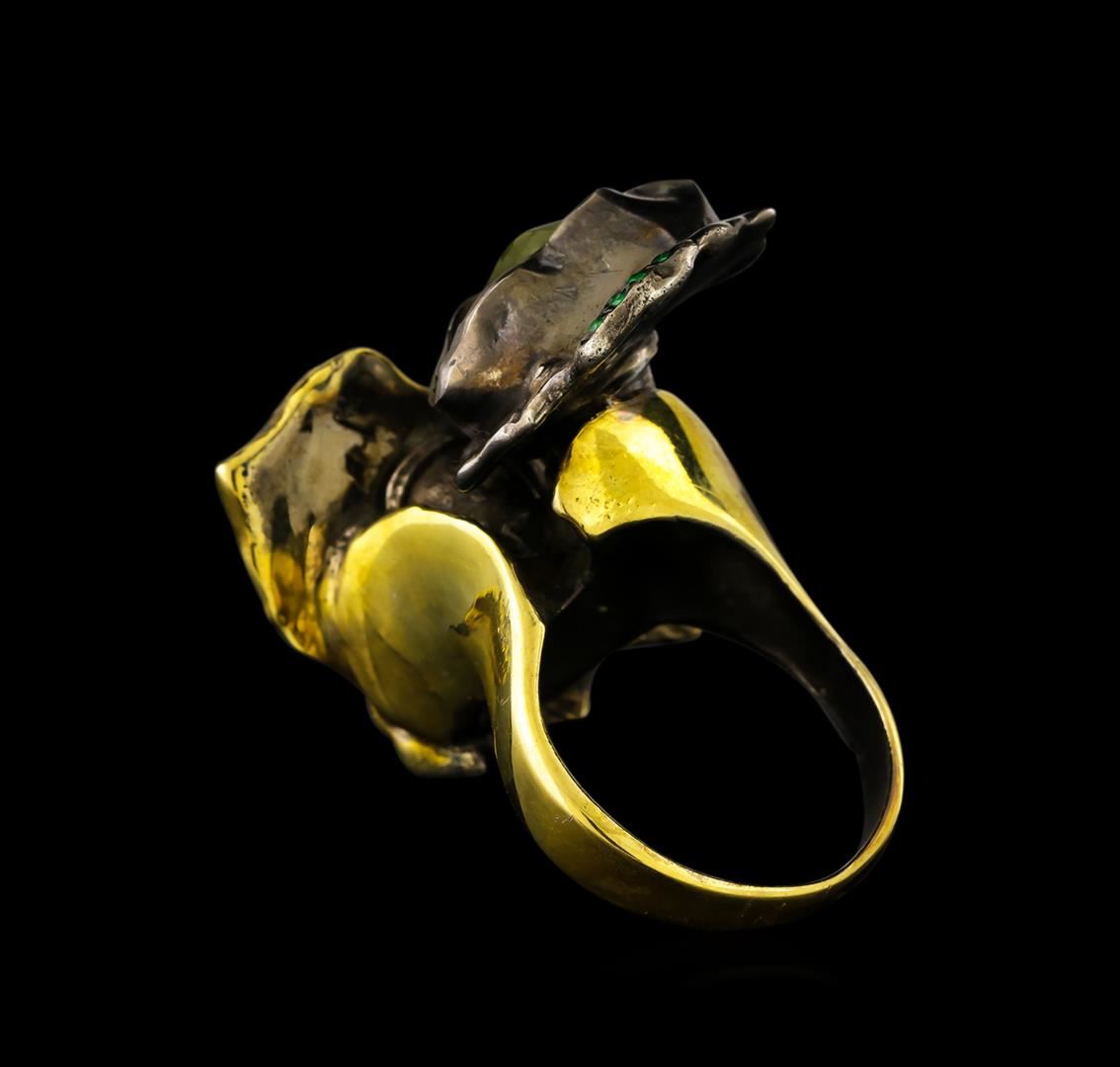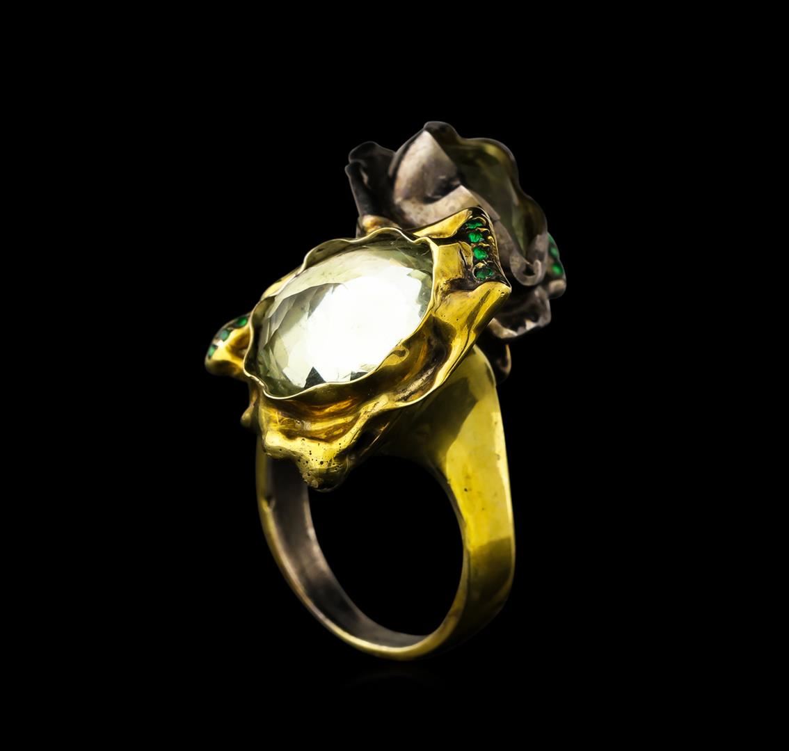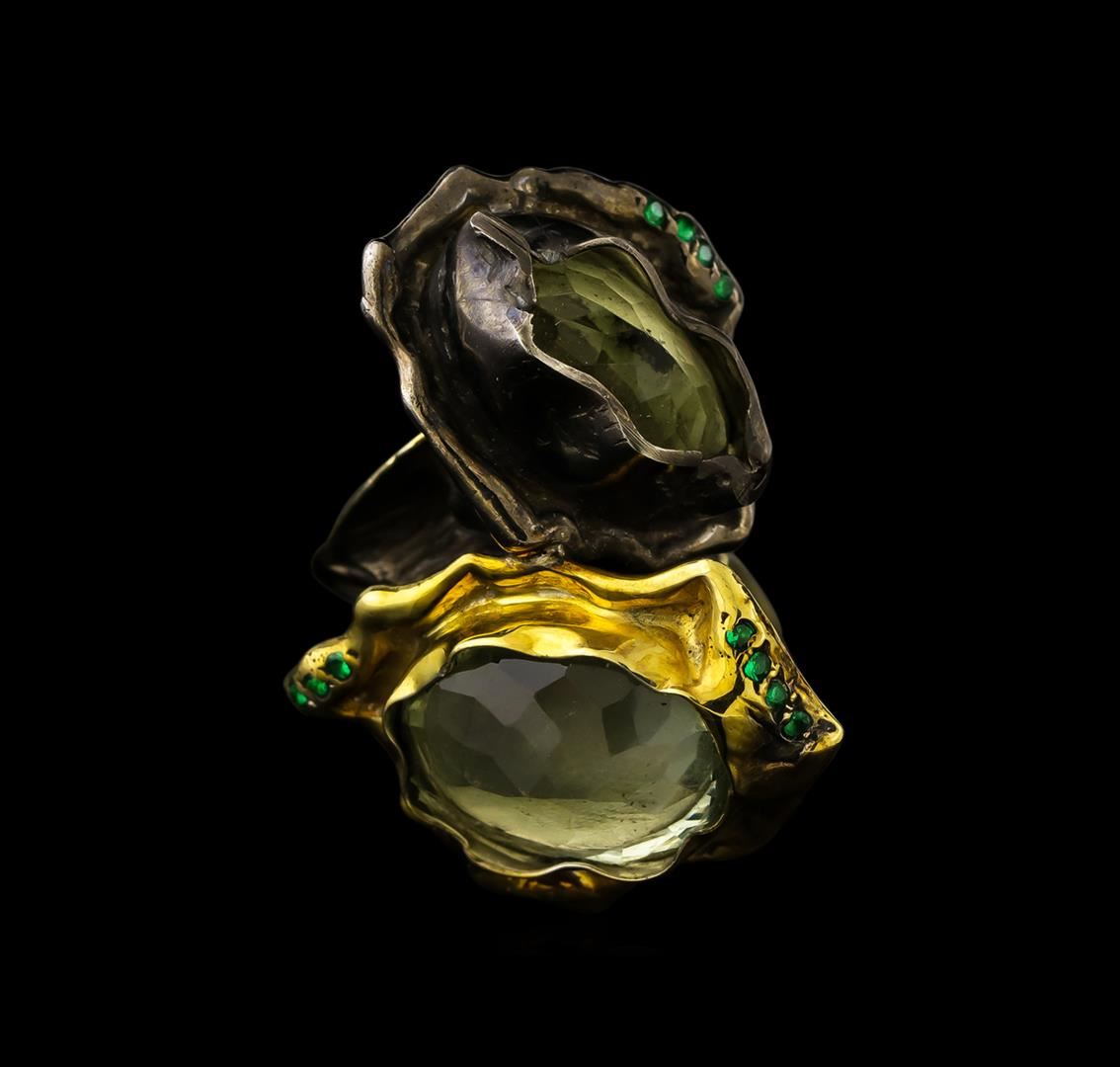 One of a kind high fashion sterling silver Ring weighing 21 grams. Black Antique texture. Containing: Lemon Quartz, Green Crystal. This sterling silver promises a lasting shine.