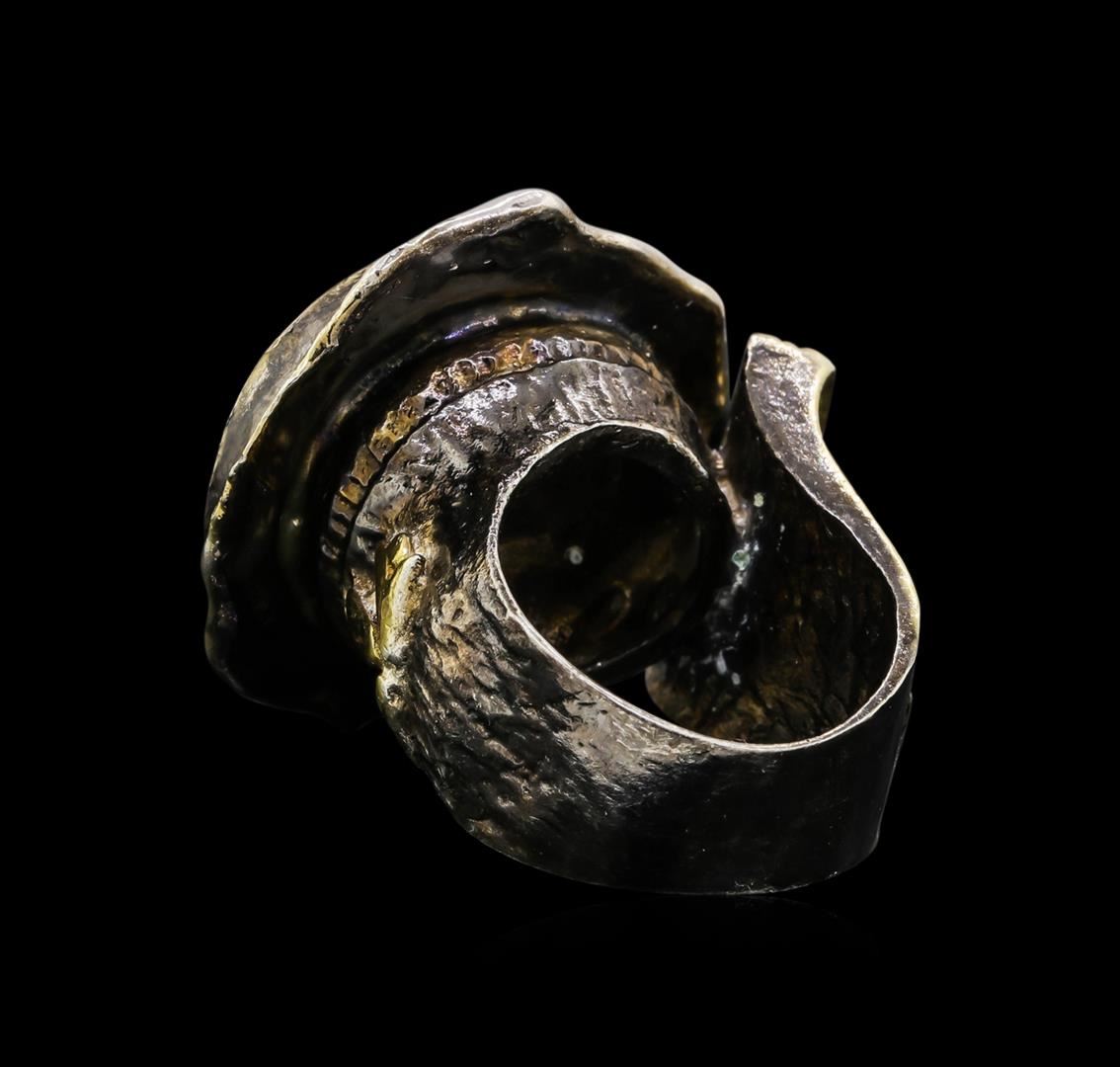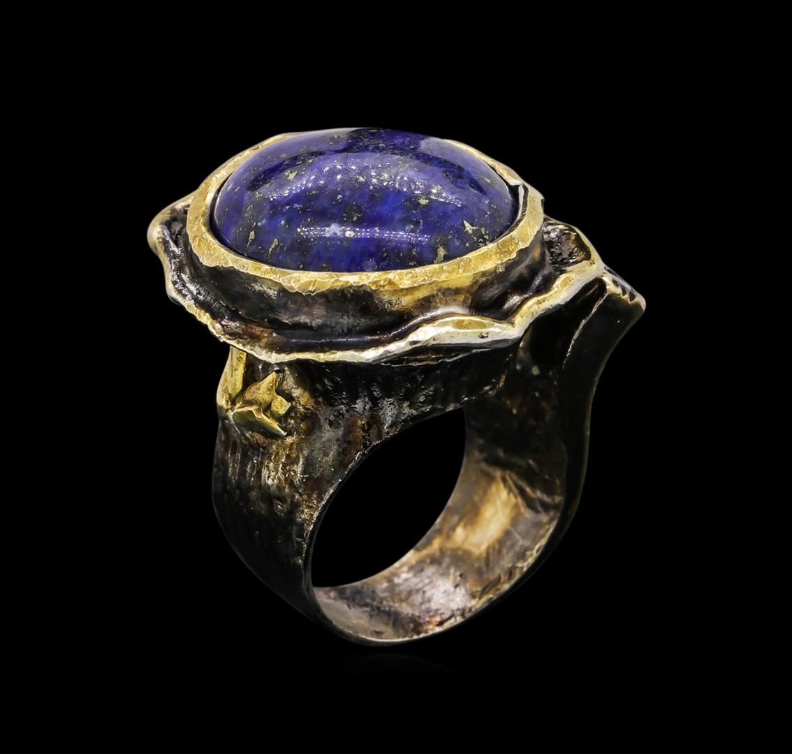 One of a kind high fashion sterling silver Ring weighing 24.1 grams. Black Antique texture. Containing: Lapis, White Crystal. This sterling silver promises a lasting shine.