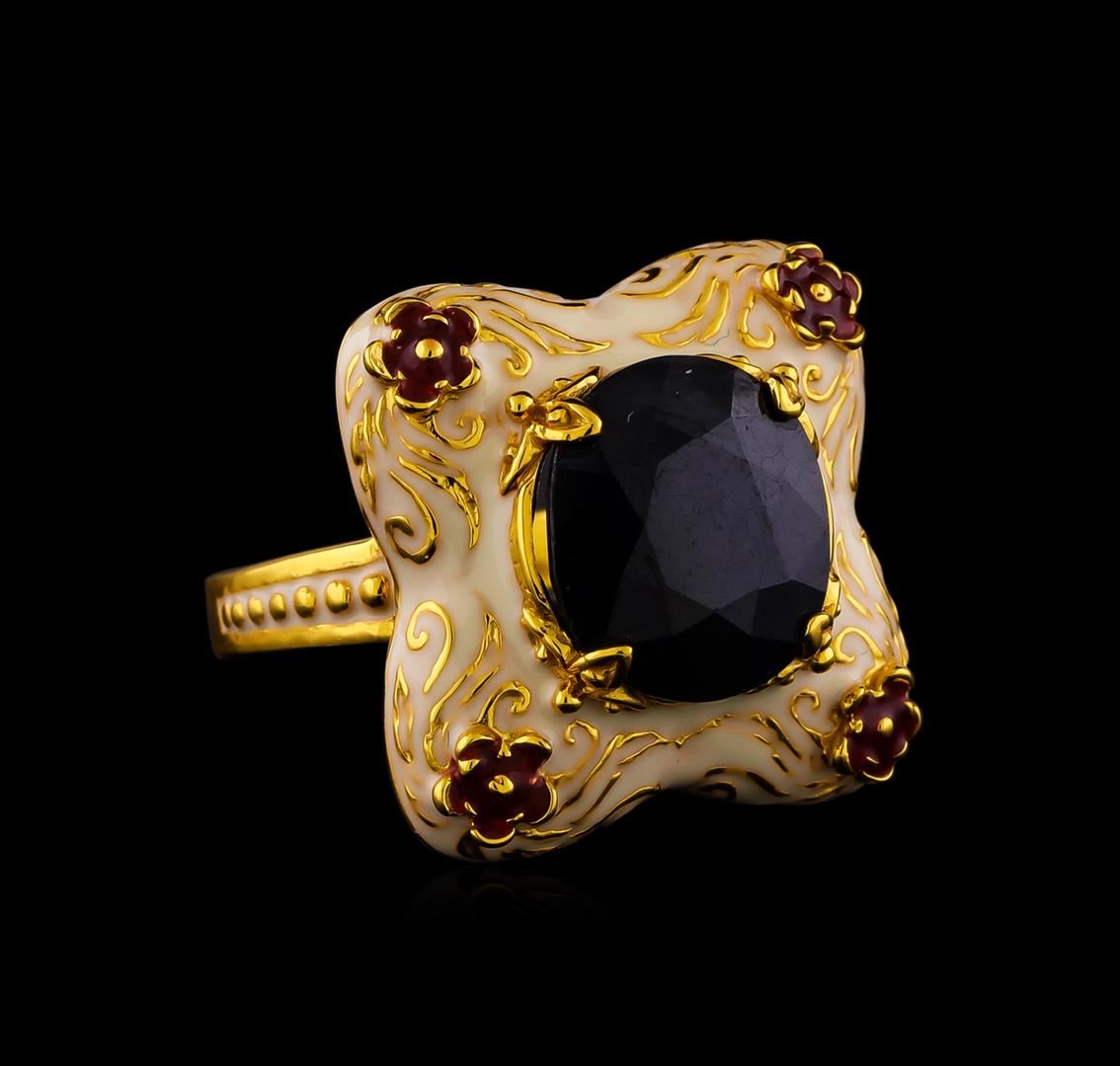 One of a kind high fashion sterling silver Ring weighing 12 grams. Containing: Sapphire, White Enamel Inlay, Red Enamel Inlay. This sterling silver promises a lasting shine.