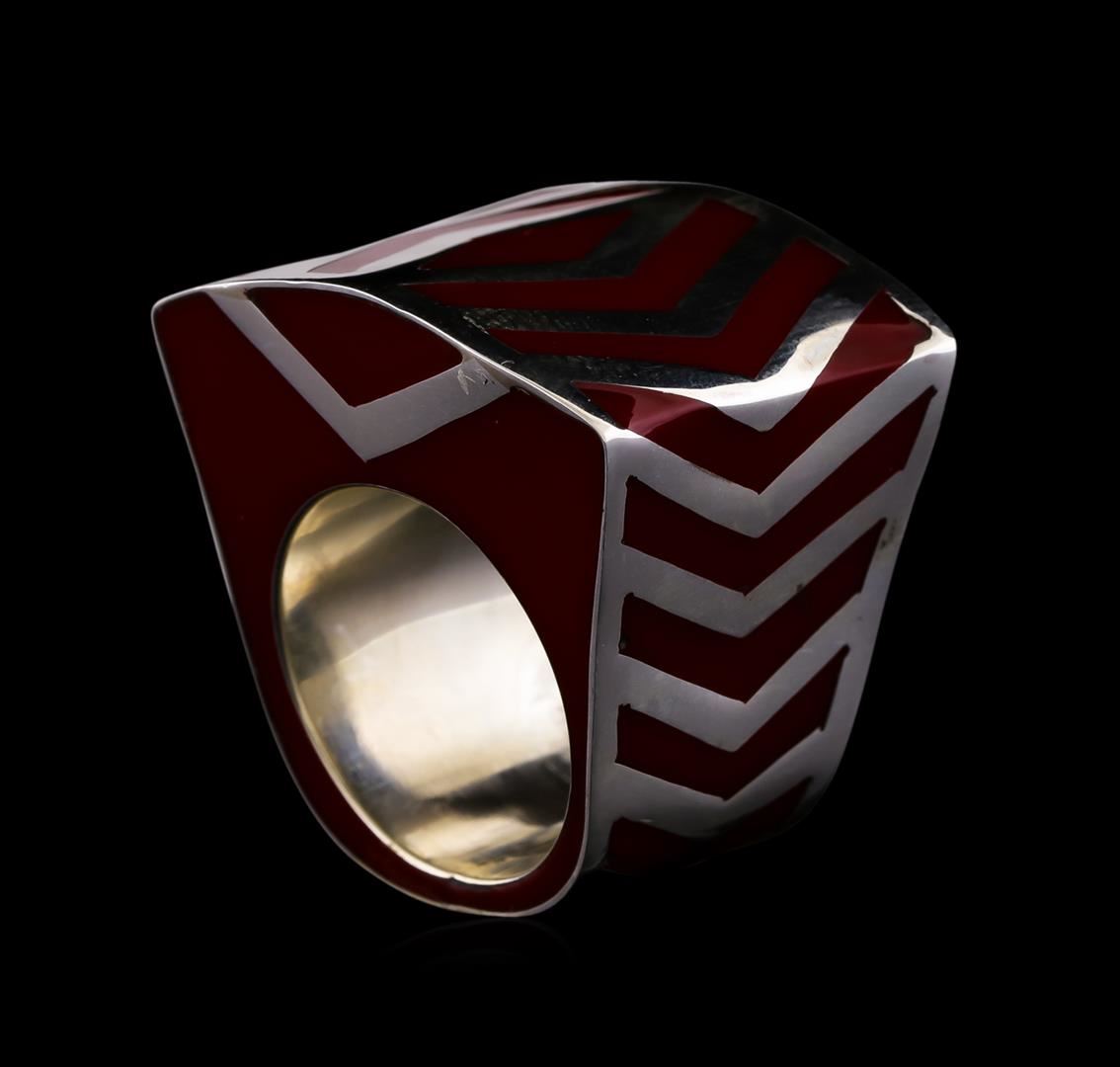 One of a kind high fashion sterling silver Ring weighing 16.6 grams. Containing: Red Enamel Inlay. This sterling silver promises a lasting shine.