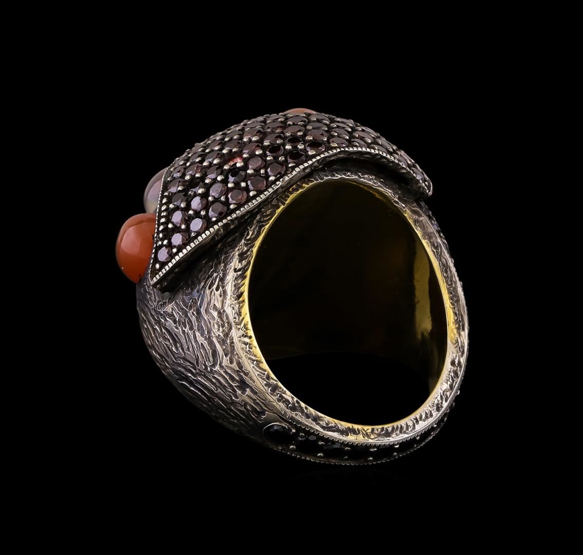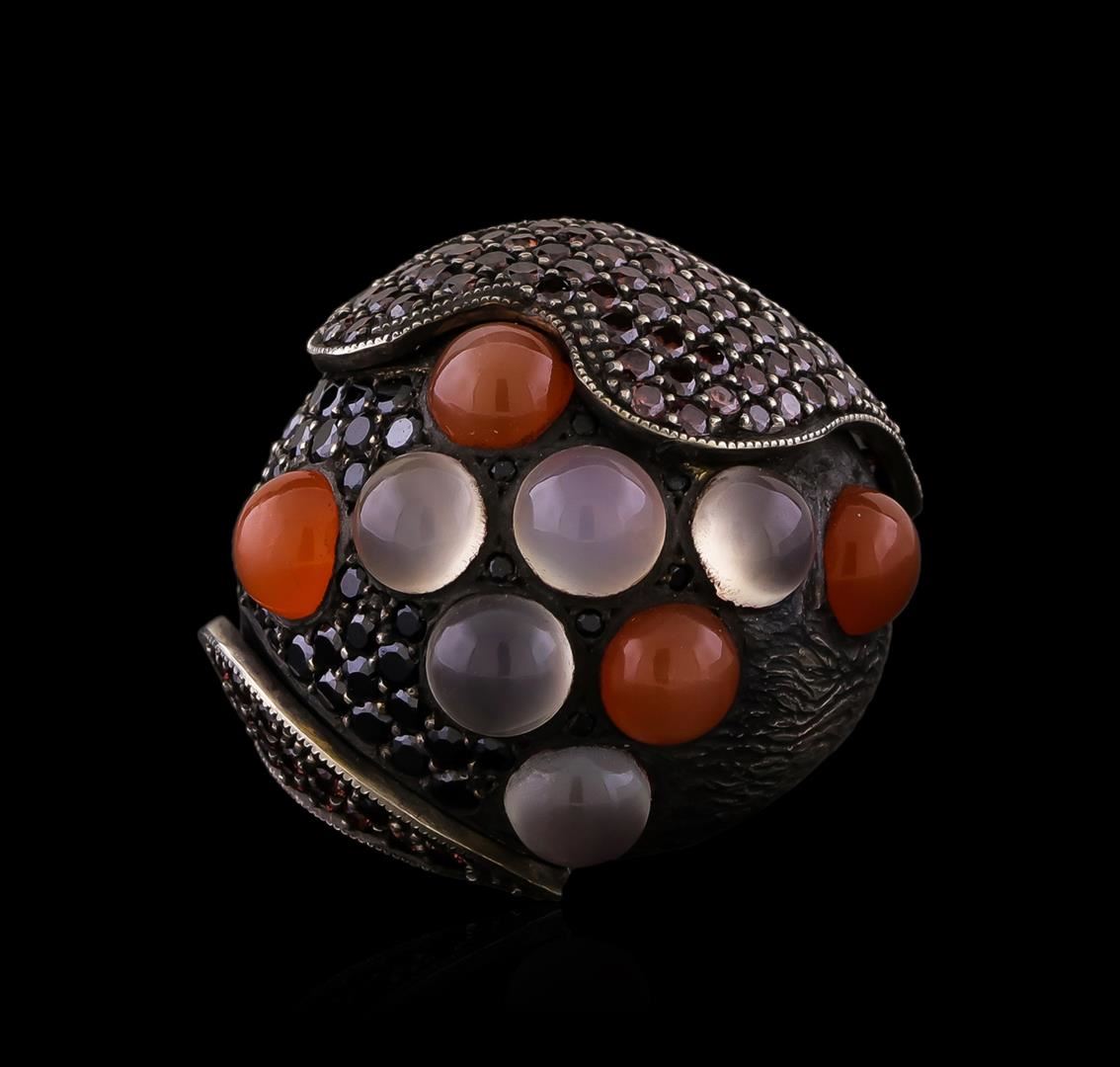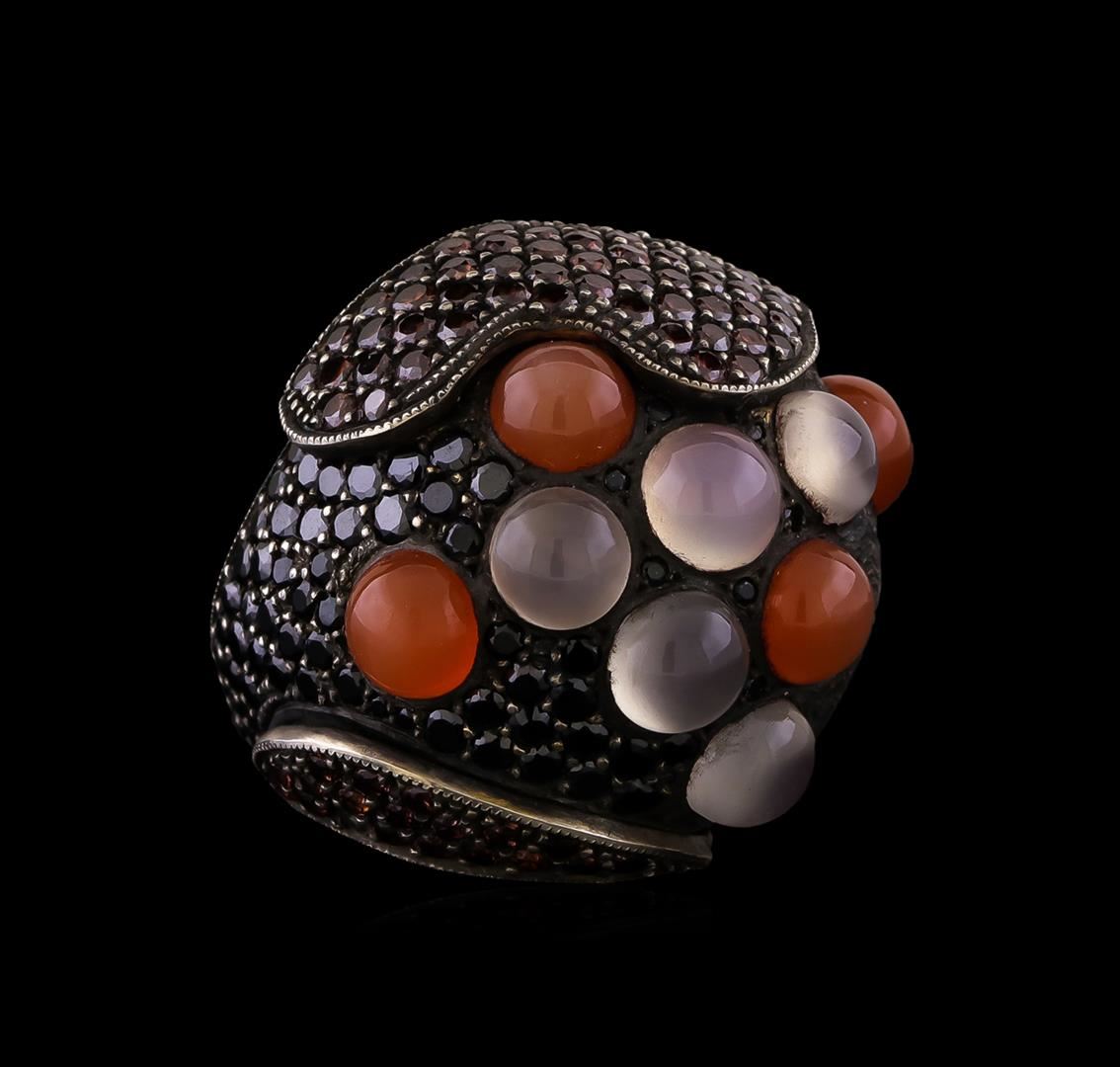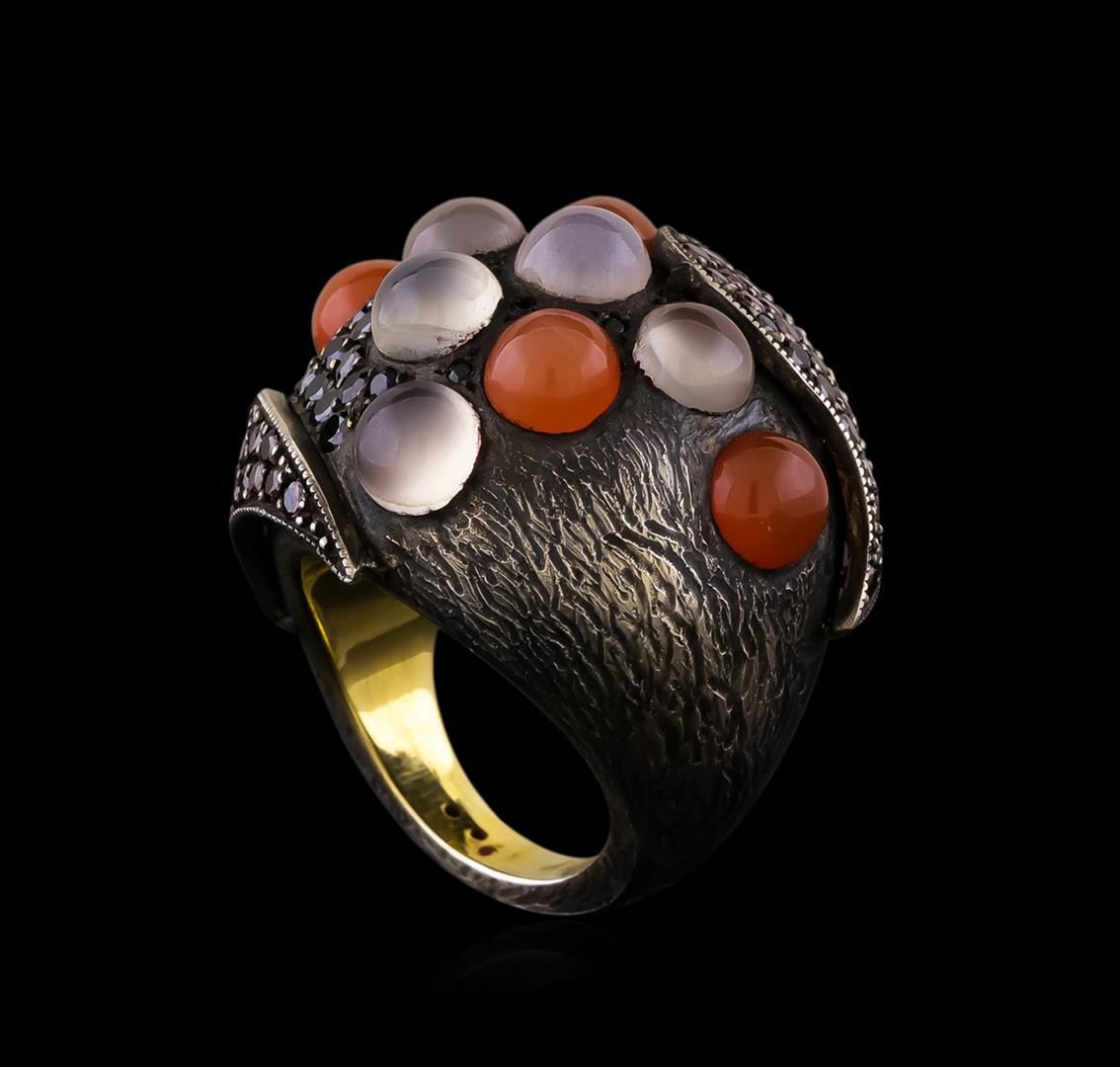 One of a kind high fashion sterling silver Ring weighing 18.7 grams. Black Antique texture. Containing: Round Agate, Black and Brown Crystals. This sterling silver promises a lasting shine.