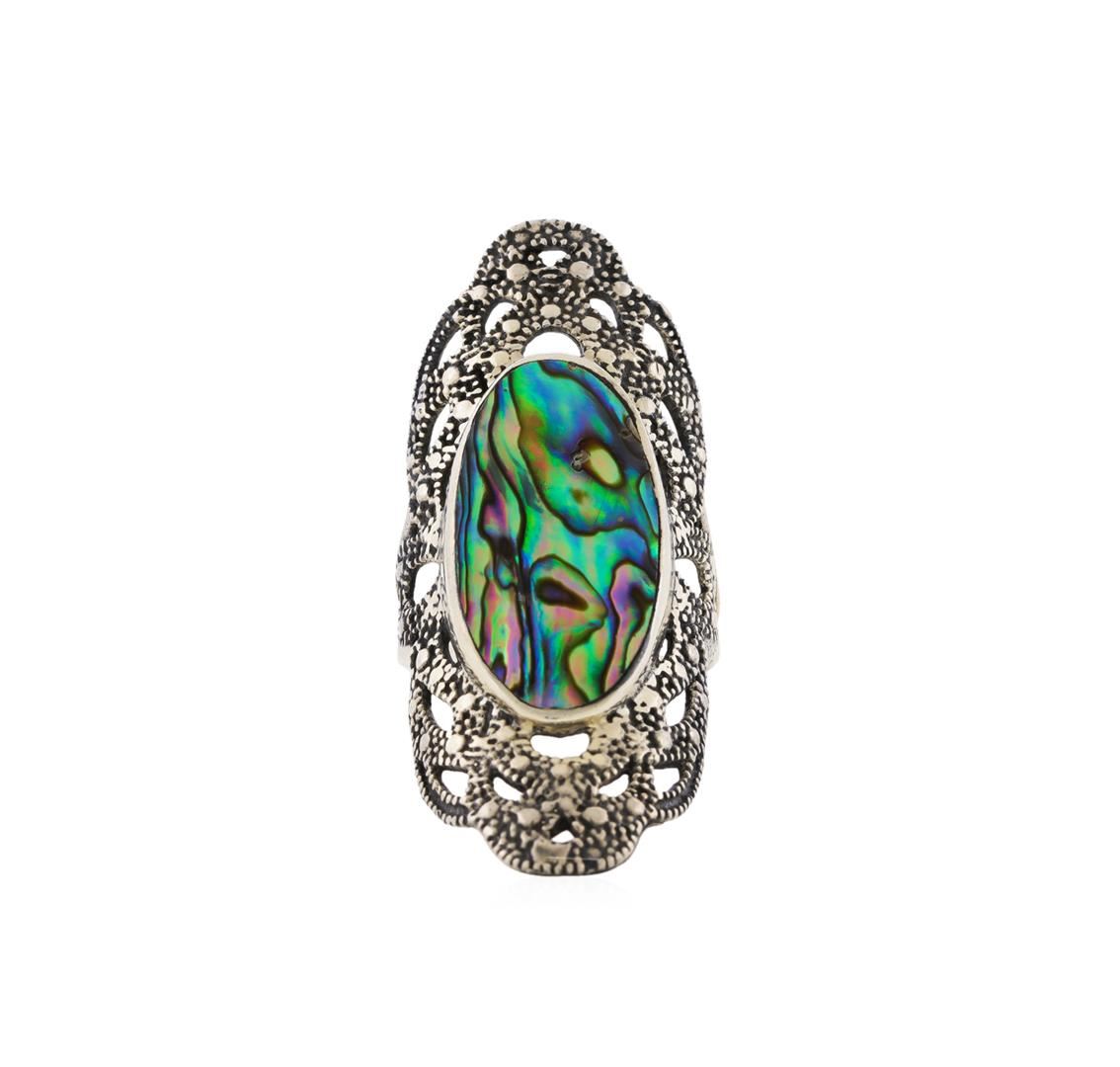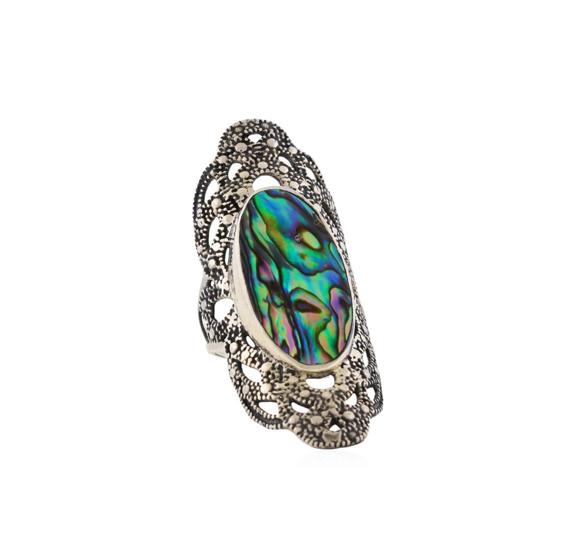 One of a kind high fashion sterling silver Ring weighing 5.6 grams. Containing: Abalone. This sterling silver promises a lasting shine.