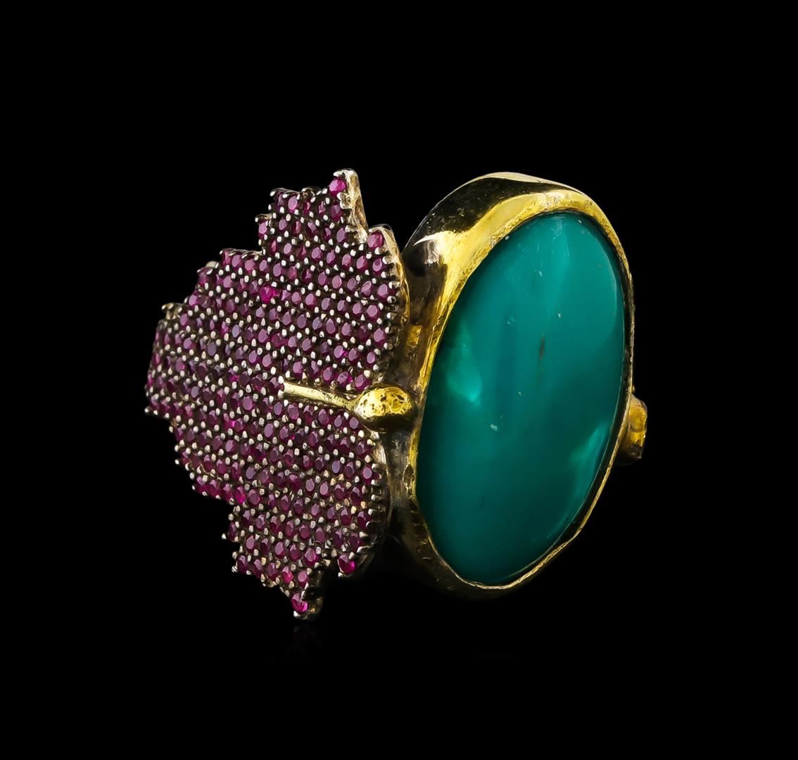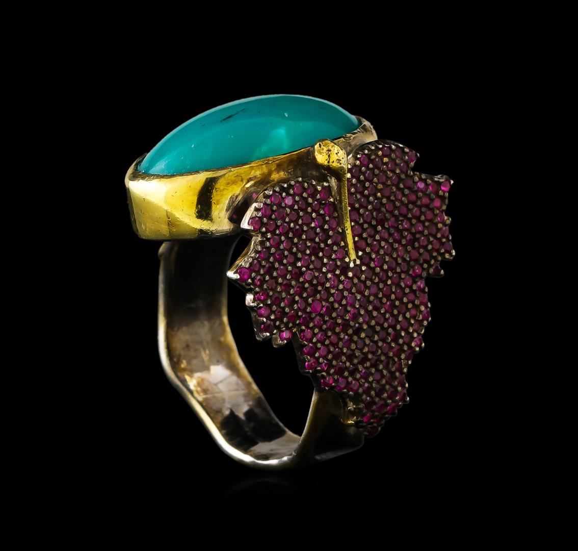 One of a kind high fashion sterling silver Ring weighing 13.9 grams. Containing: Turquoise, White Crystal, Red Crystal. This sterling silver promises a lasting shine.