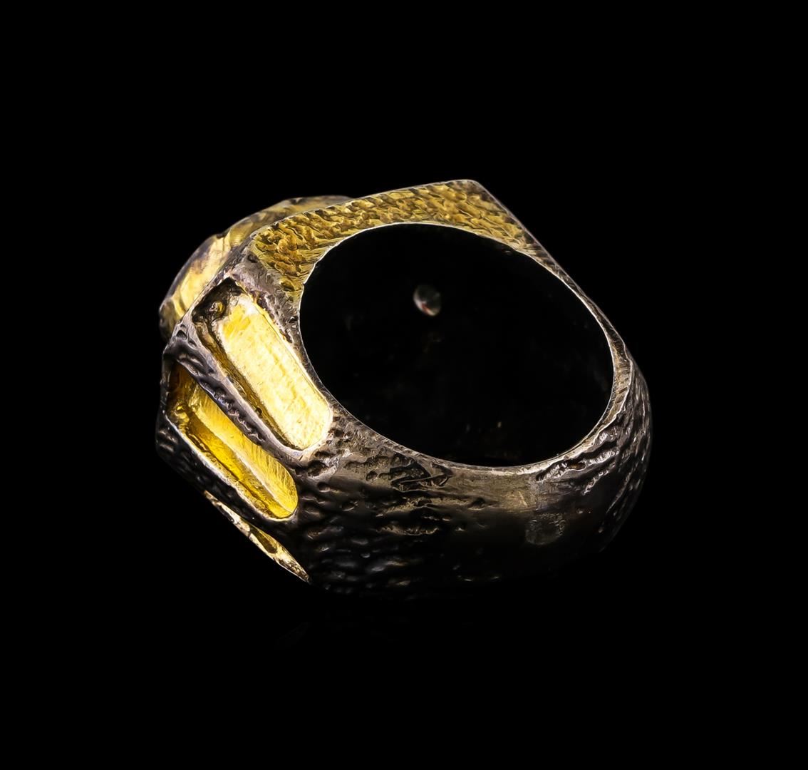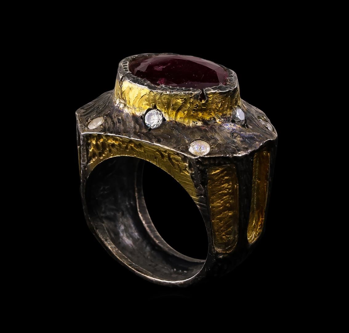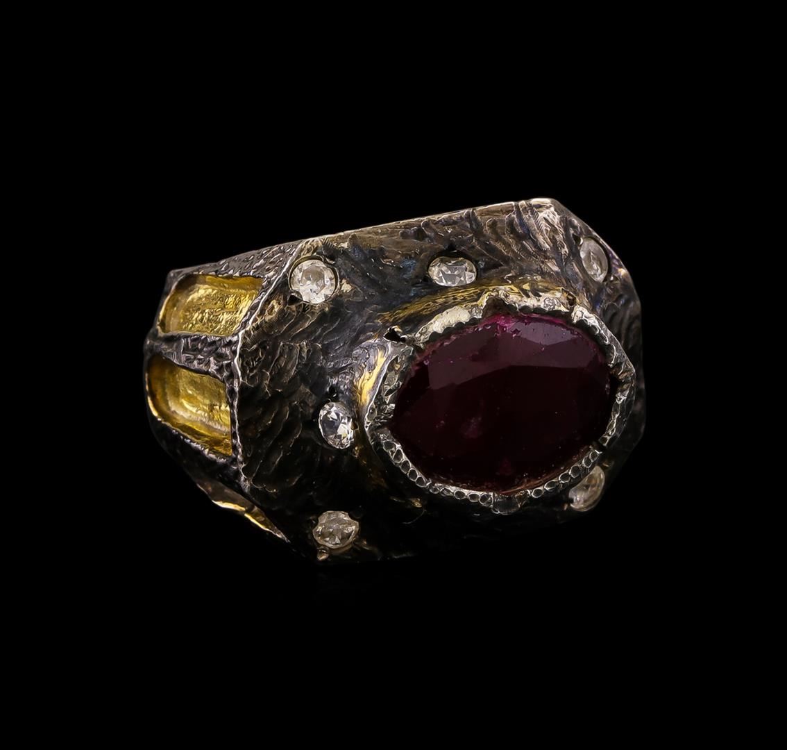 One of a kind high fashion sterling silver Ring weighing 19.7 grams. Black Antique texture. Containing: Ruby, White Crystal. This sterling silver promises a lasting shine.