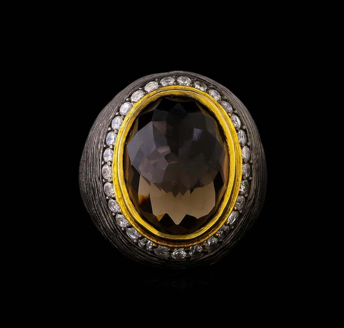 One of a kind high fashion sterling silver Ring weighing 12 grams. Black Antique texture. Containing: Smoky Quartz, White Crystal. This sterling silver promises a lasting shine.