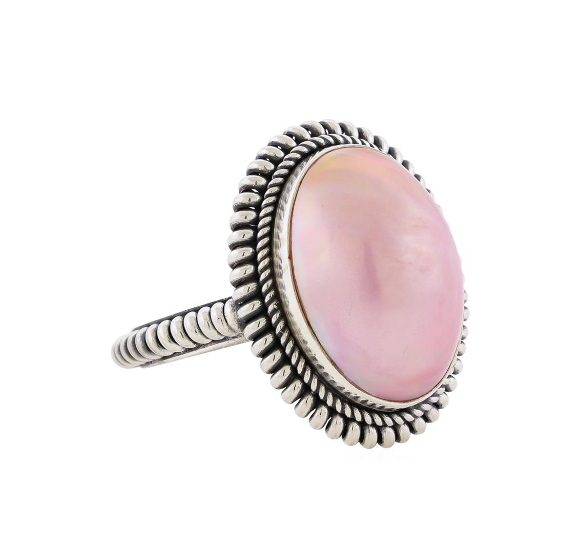 One of a kind high fashion sterling silver Ring weighing 4.8 grams. Containing: Dyed Pink Mabe Pearl. This sterling silver promises a lasting shine.