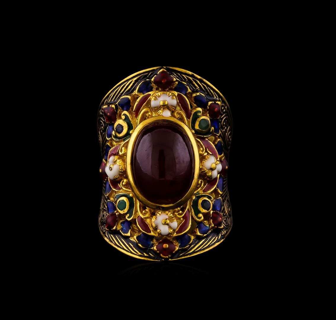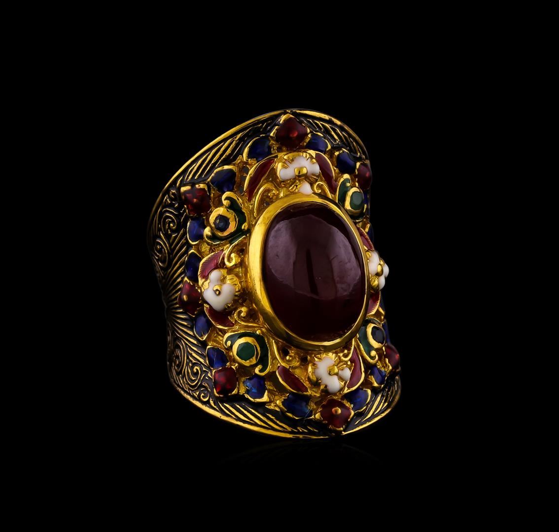 One of a kind high fashion sterling silver Ring weighing 20.2 grams. Containing: Ruby, Multi-color Enamel Inlay. This sterling silver promises a lasting shine.
