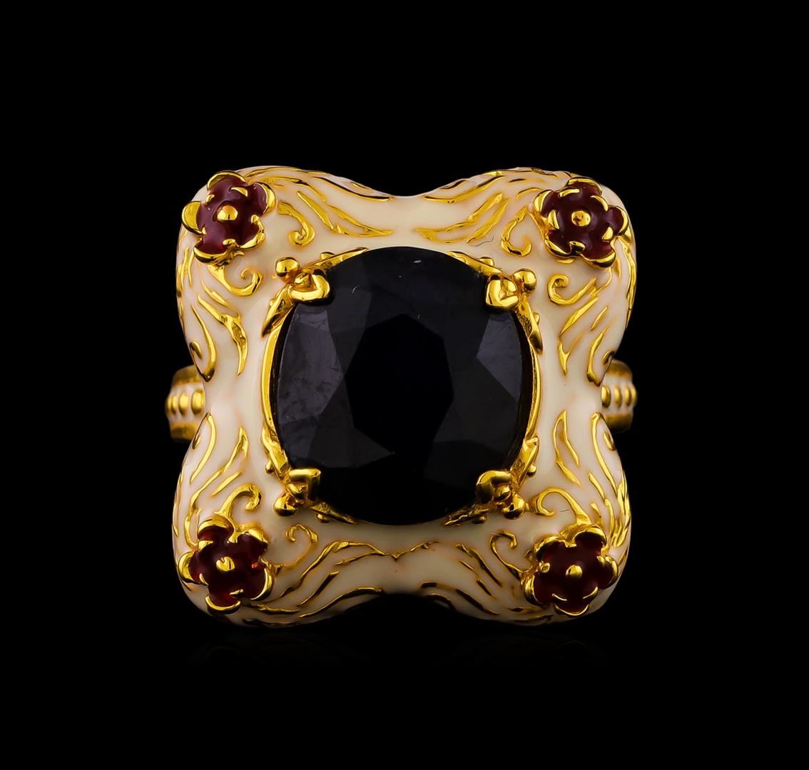 One of a kind high fashion sterling silver Ring weighing 12 grams. Containing: Sapphire, White Enamel Inlay, Red Enamel Inlay. This sterling silver promises a lasting shine.