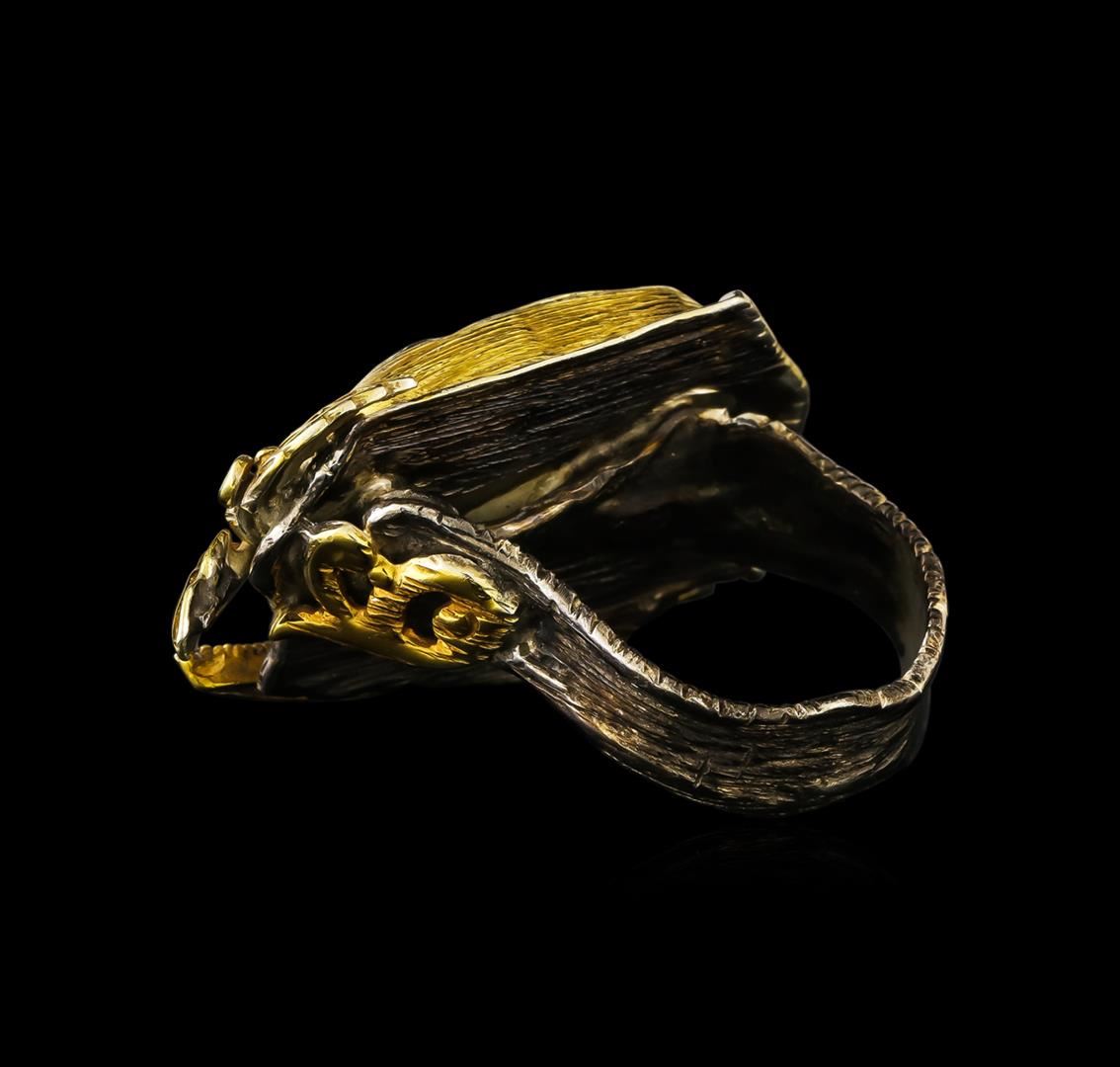 One of a kind high fashion sterling silver Ring weighing 16.6 grams. Black Antique texture. Containing: Created Turquoise, White Crystal. This sterling silver promises a lasting shine.