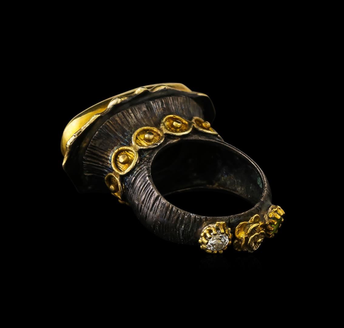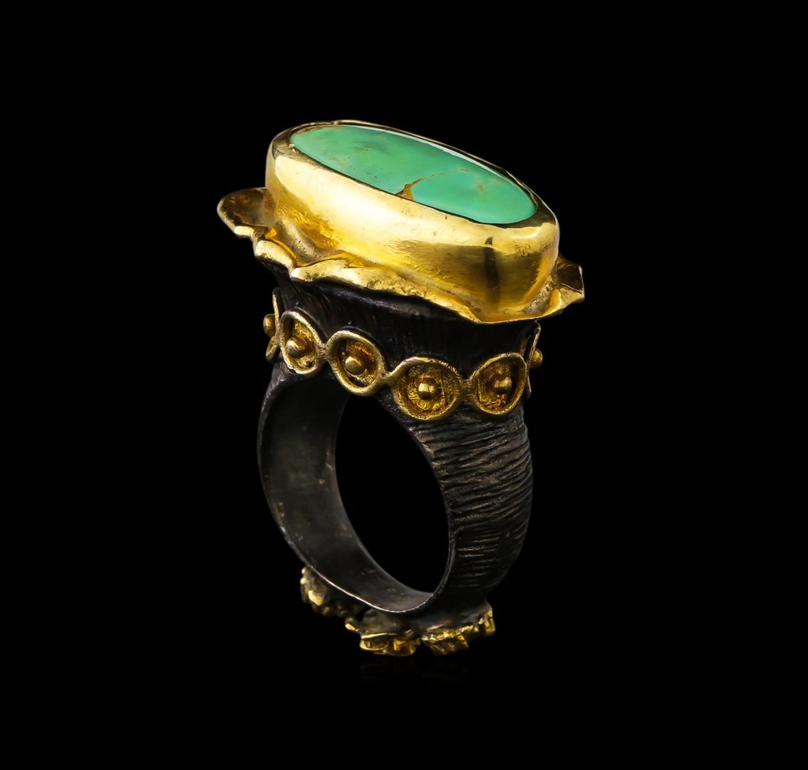 One of a kind high fashion sterling silver Ring weighing 20.9 grams. Black Antique texture. Containing: Turquoise, Peridot, White Crystal. This sterling silver promises a lasting shine.