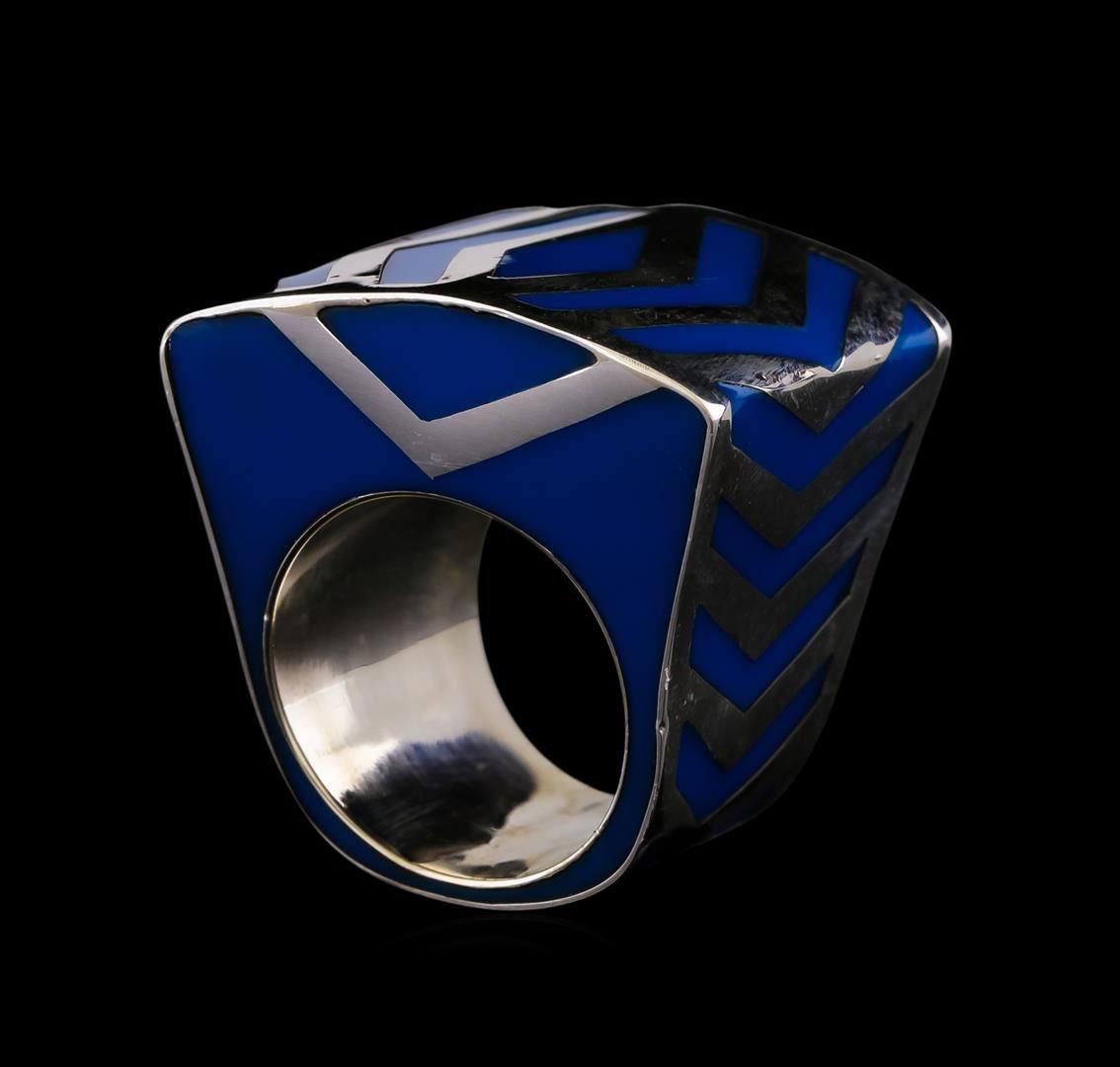 One of a kind high fashion sterling silver Ring weighing 16.8 grams. Containing: Blue Enamel Inlay. This sterling silver promises a lasting shine.