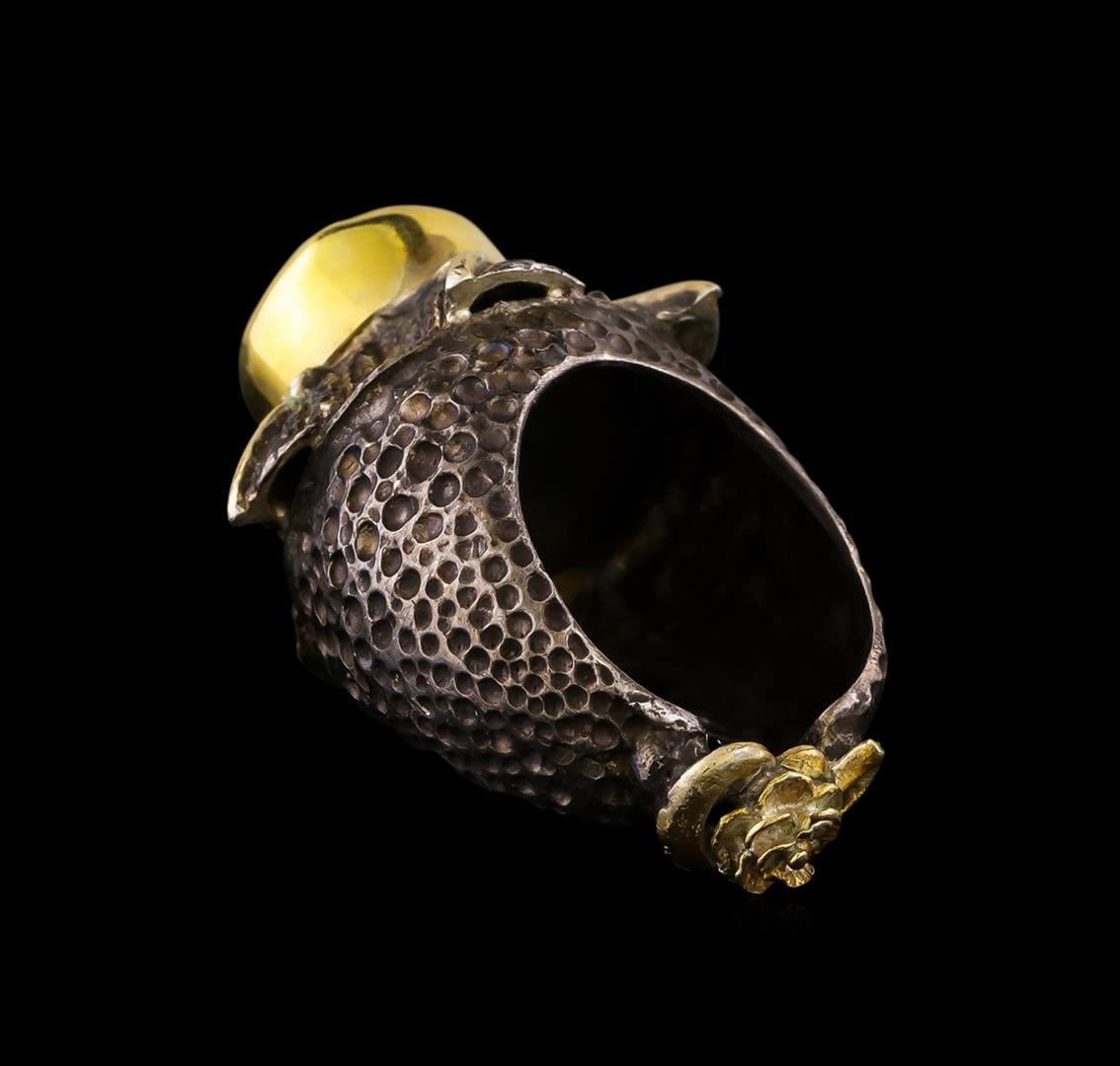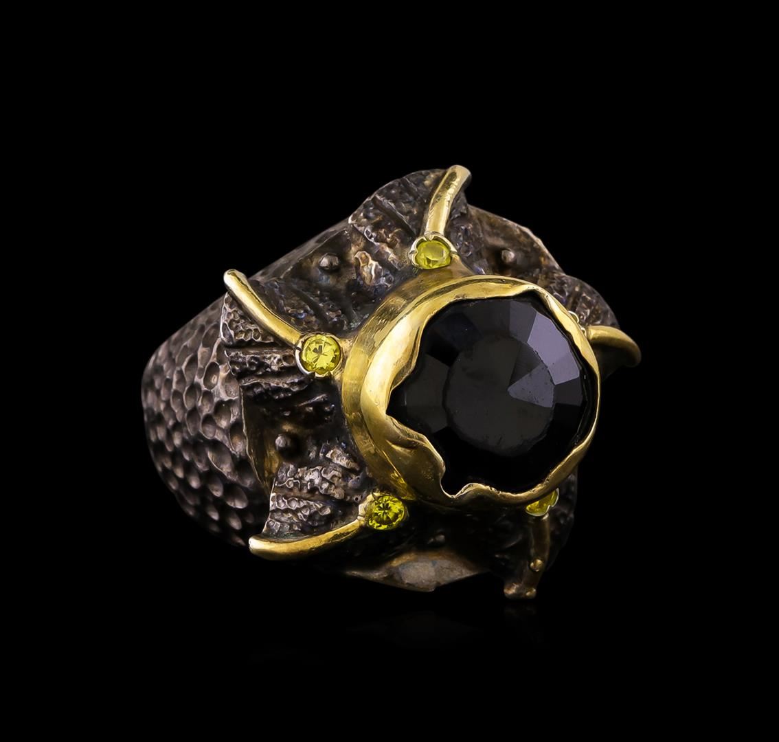 One of a kind high fashion sterling silver Ring weighing 23.5 grams. Black Antique texture. Containing: Black Tourmaline, Yellow Crystal. This sterling silver promises a lasting shine.