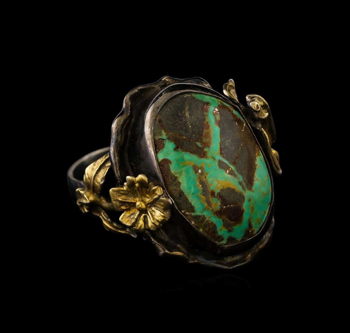 One of a kind high fashion sterling silver Ring weighing 23 grams. Black Antique texture. Containing: Turquoise. This sterling silver promises a lasting shine.
