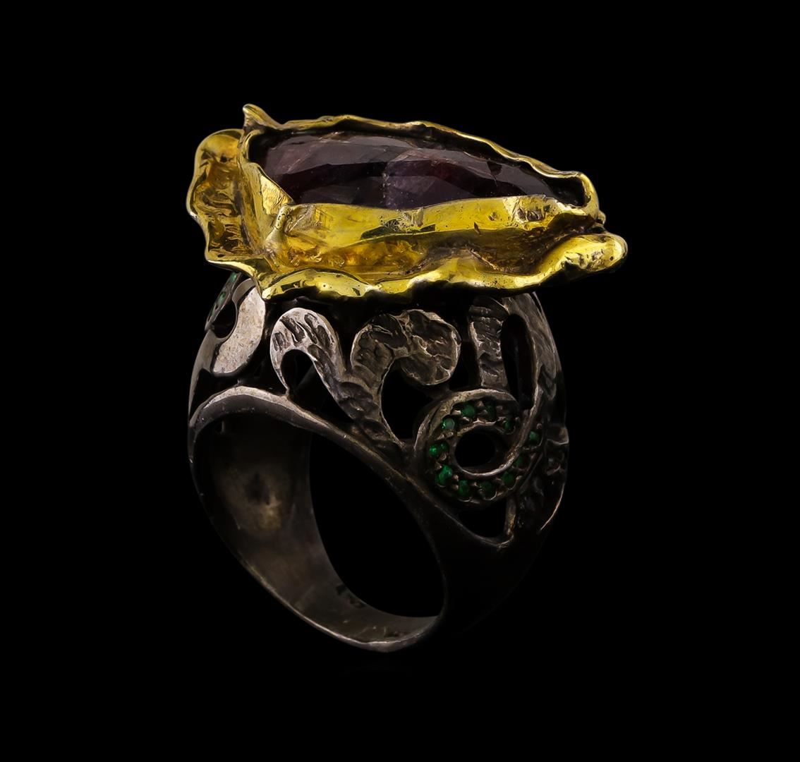 One of a kind high fashion sterling silver Ring weighing 20 grams. Containing: Corundum, Green Crystal. This sterling silver promises a lasting shine.