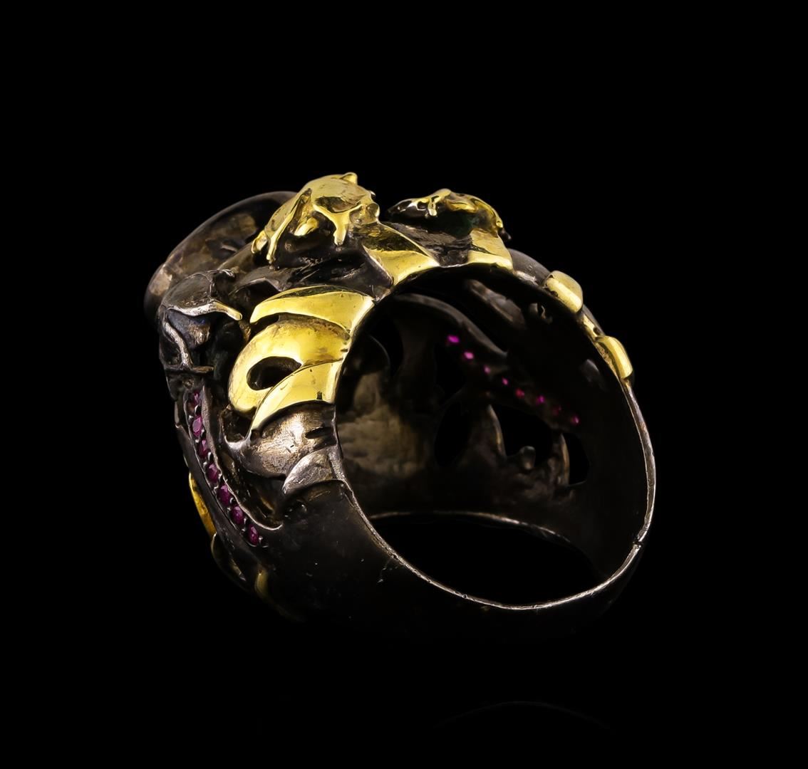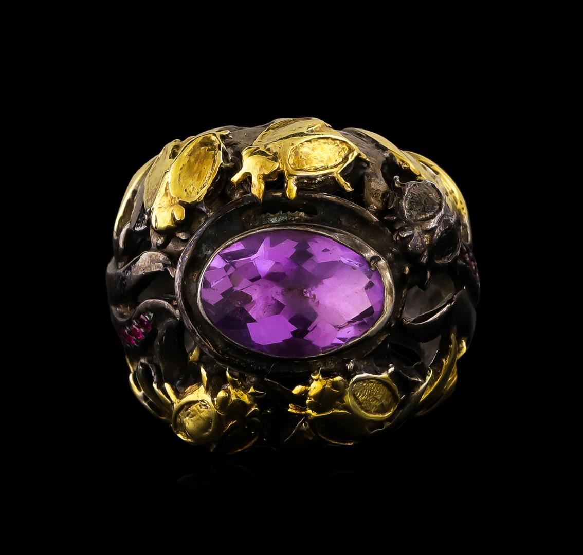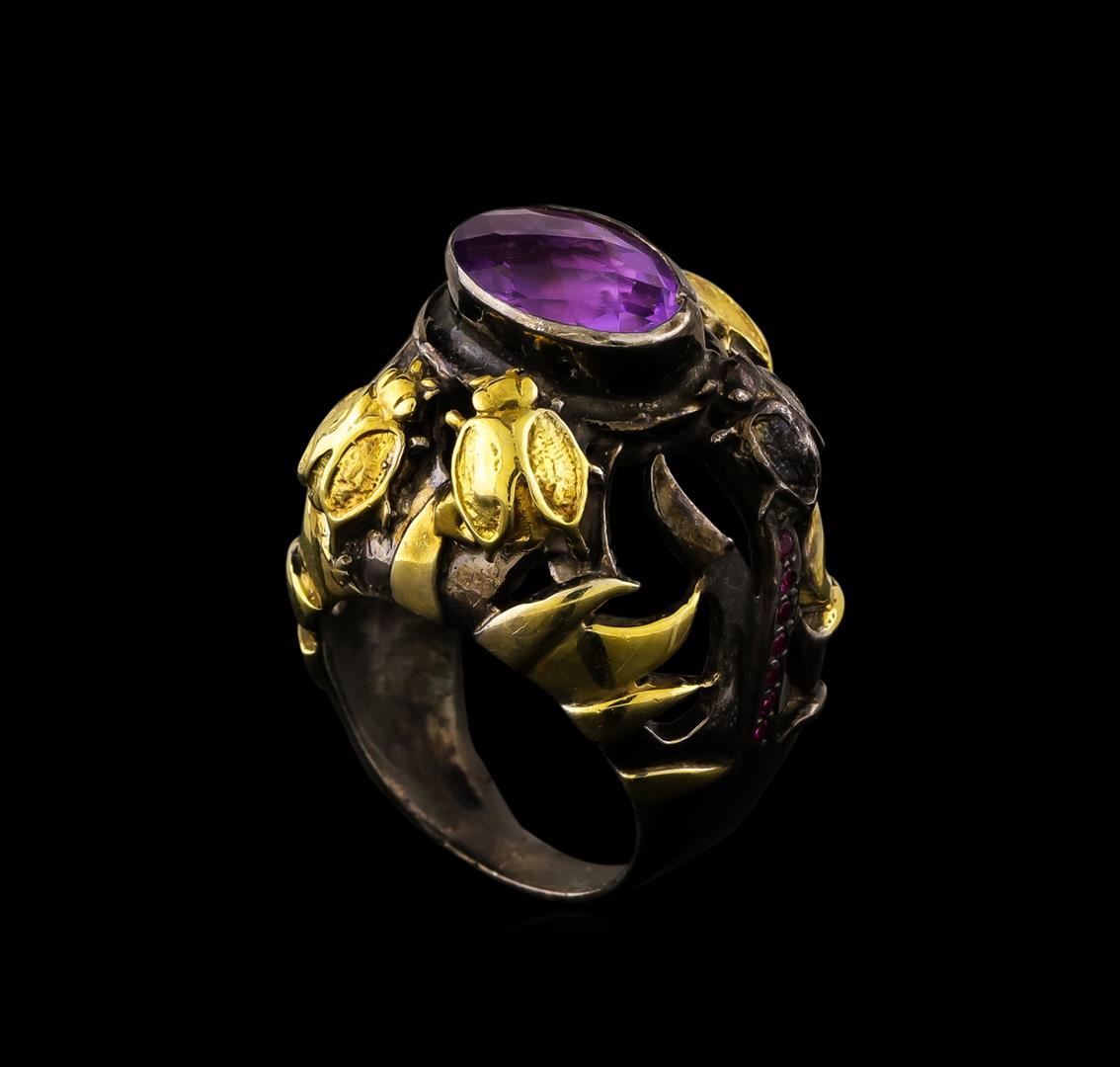 One of a kind high fashion sterling silver Ring weighing 18.5 grams. Black Antique texture. Containing: Amethyst, Synthetic Ruby. This sterling silver promises a lasting shine.
