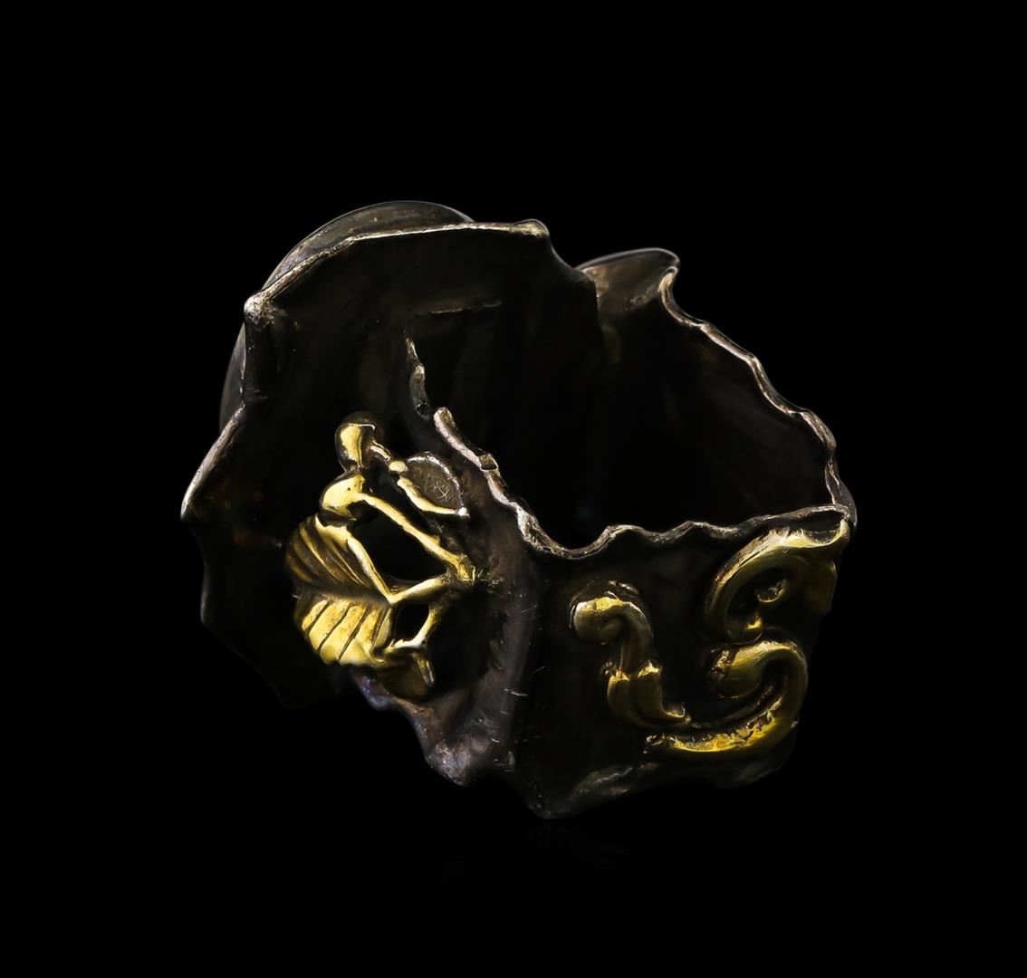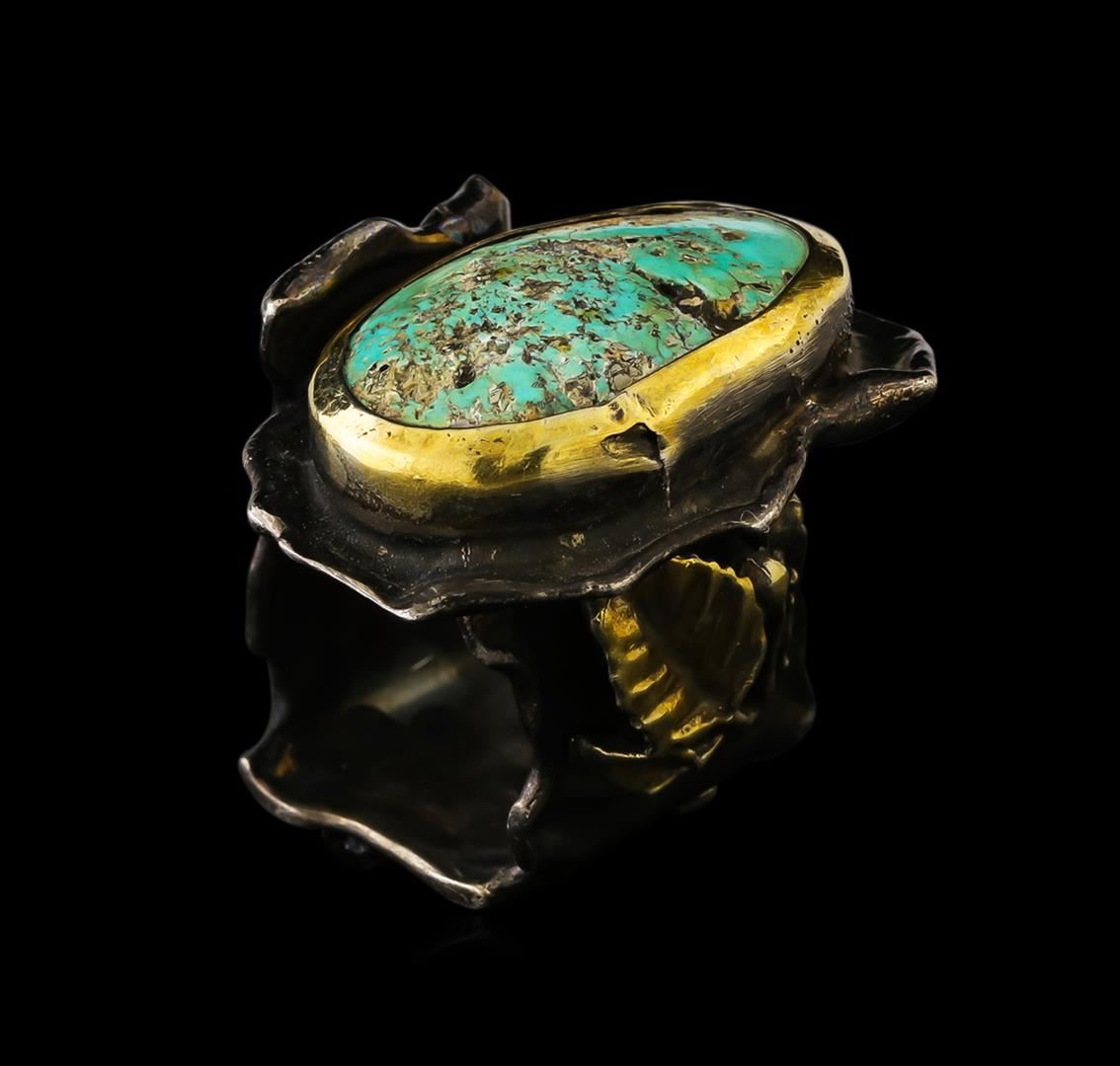 One of a kind high fashion sterling silver Ring weighing 16.9 grams. Black Antique texture. Containing: Turquoise. This sterling silver promises a lasting shine.