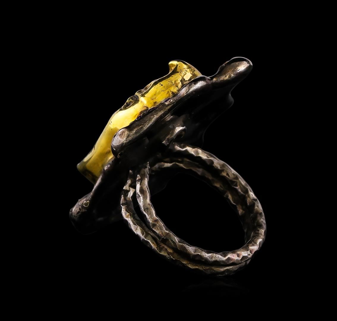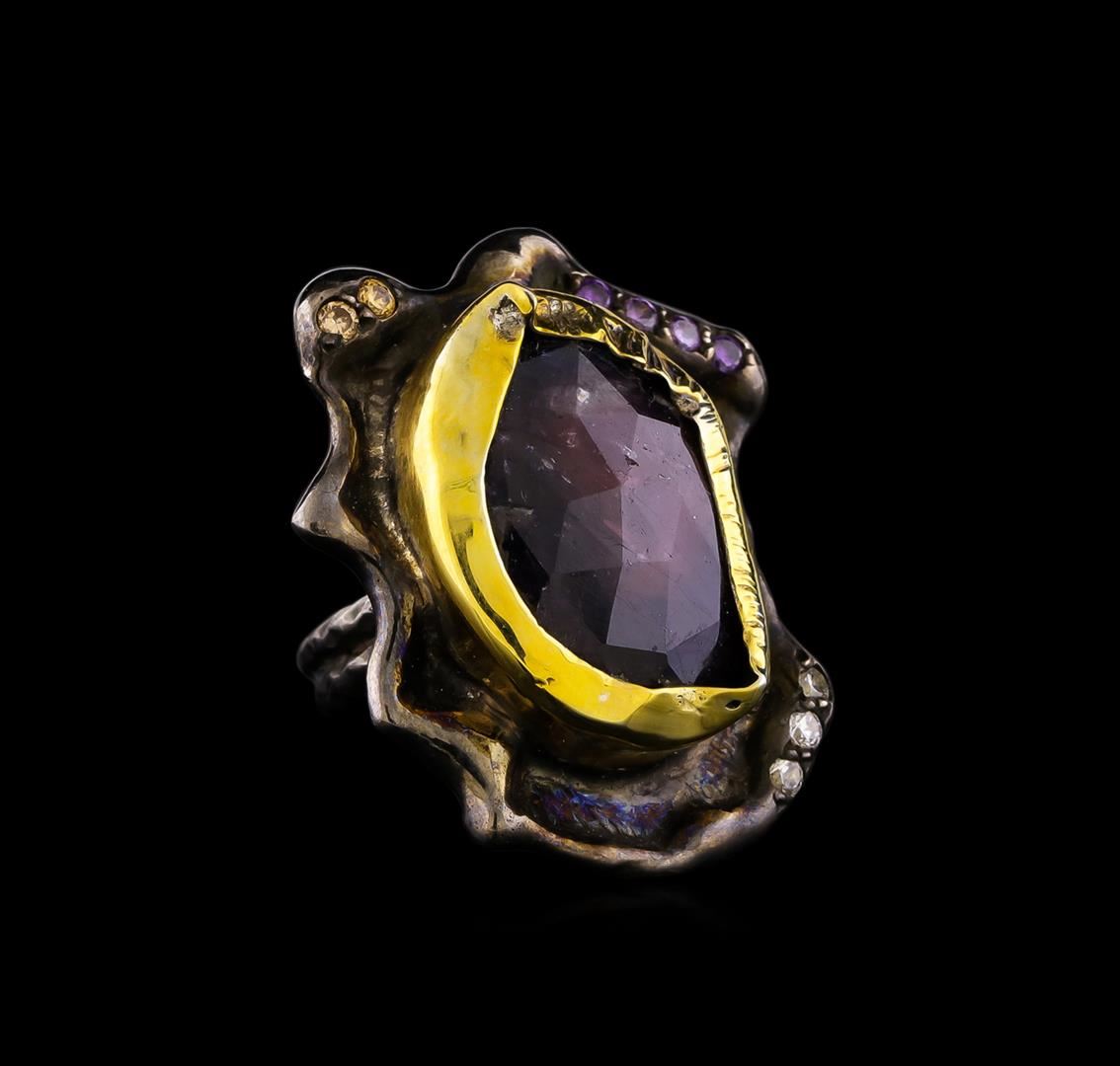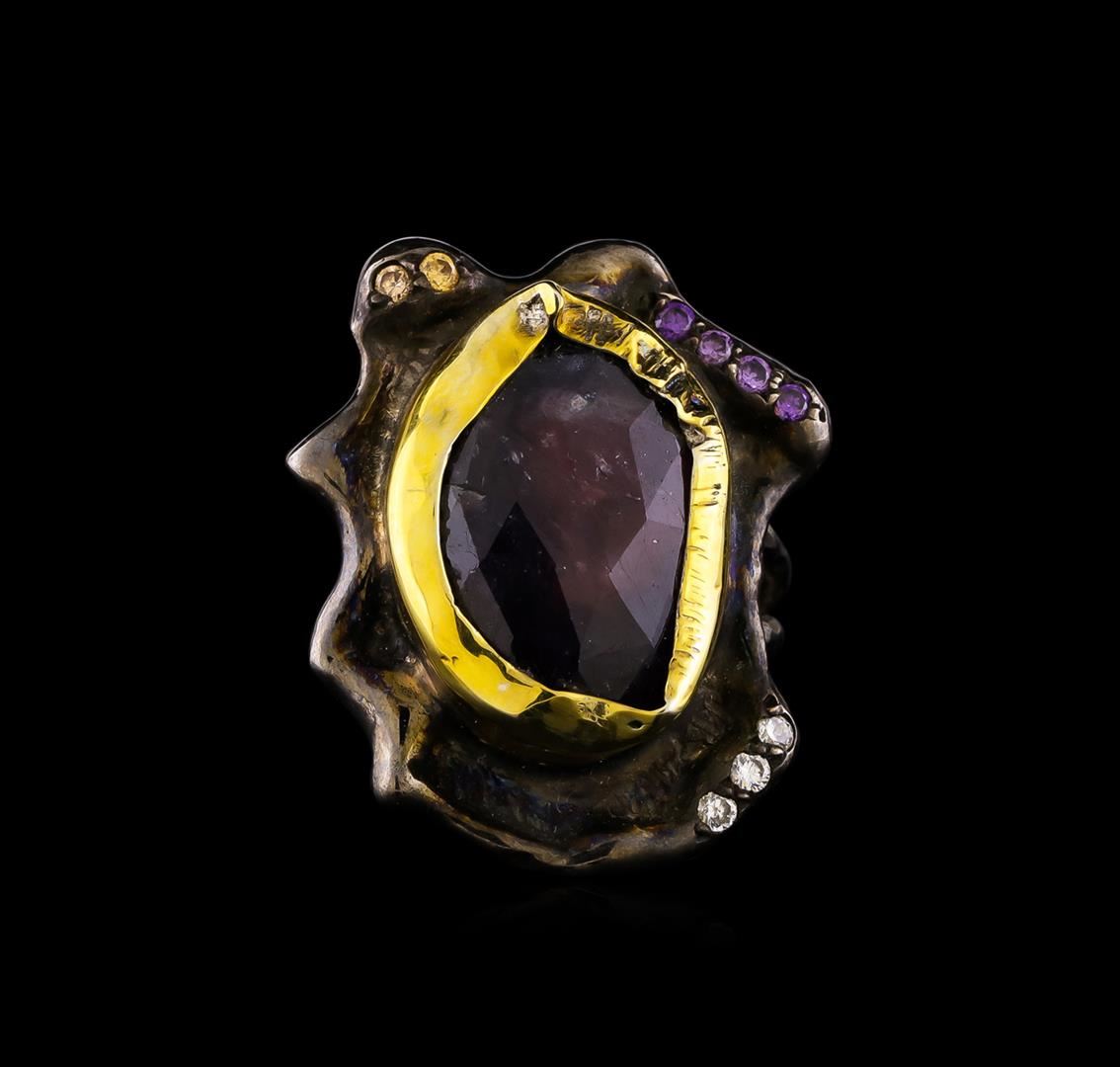 One of a kind high fashion sterling silver Ring weighing 14.5 grams. Black Antique texture. Containing: Ruby, Purple Crystal, White Crystal, Brown Crystal. This sterling silver promises a lasting shine.
