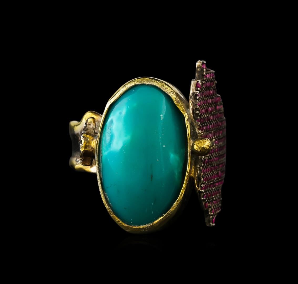 One of a kind high fashion sterling silver Ring weighing 13.9 grams. Containing: Turquoise, White Crystal, Red Crystal. This sterling silver promises a lasting shine.