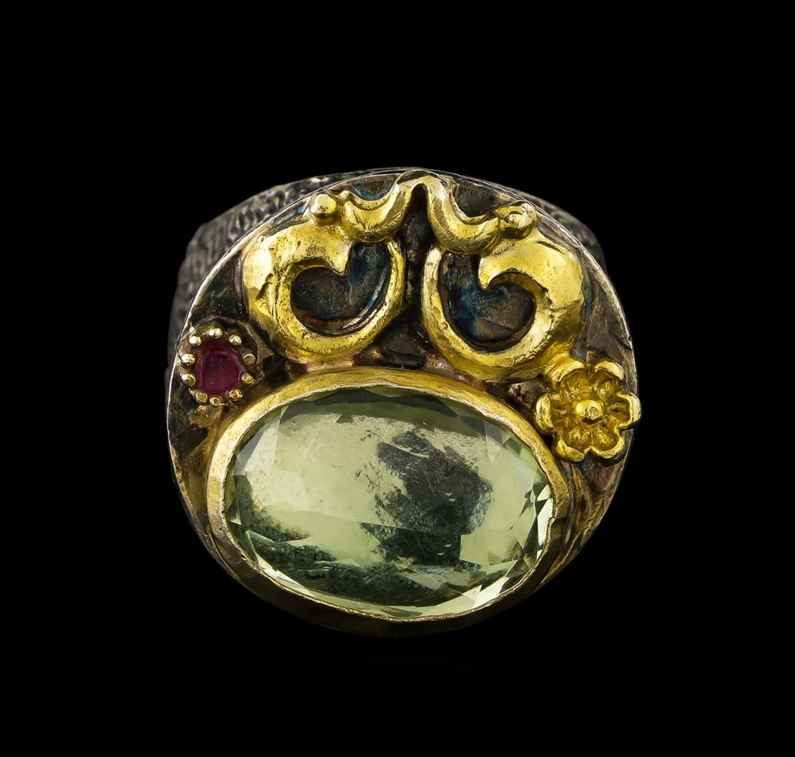 One of a kind high fashion sterling silver Ring weighing 20.4 grams. Black Antique texture. Containing: Lemon Quartz, Ruby. This sterling silver promises a lasting shine.
