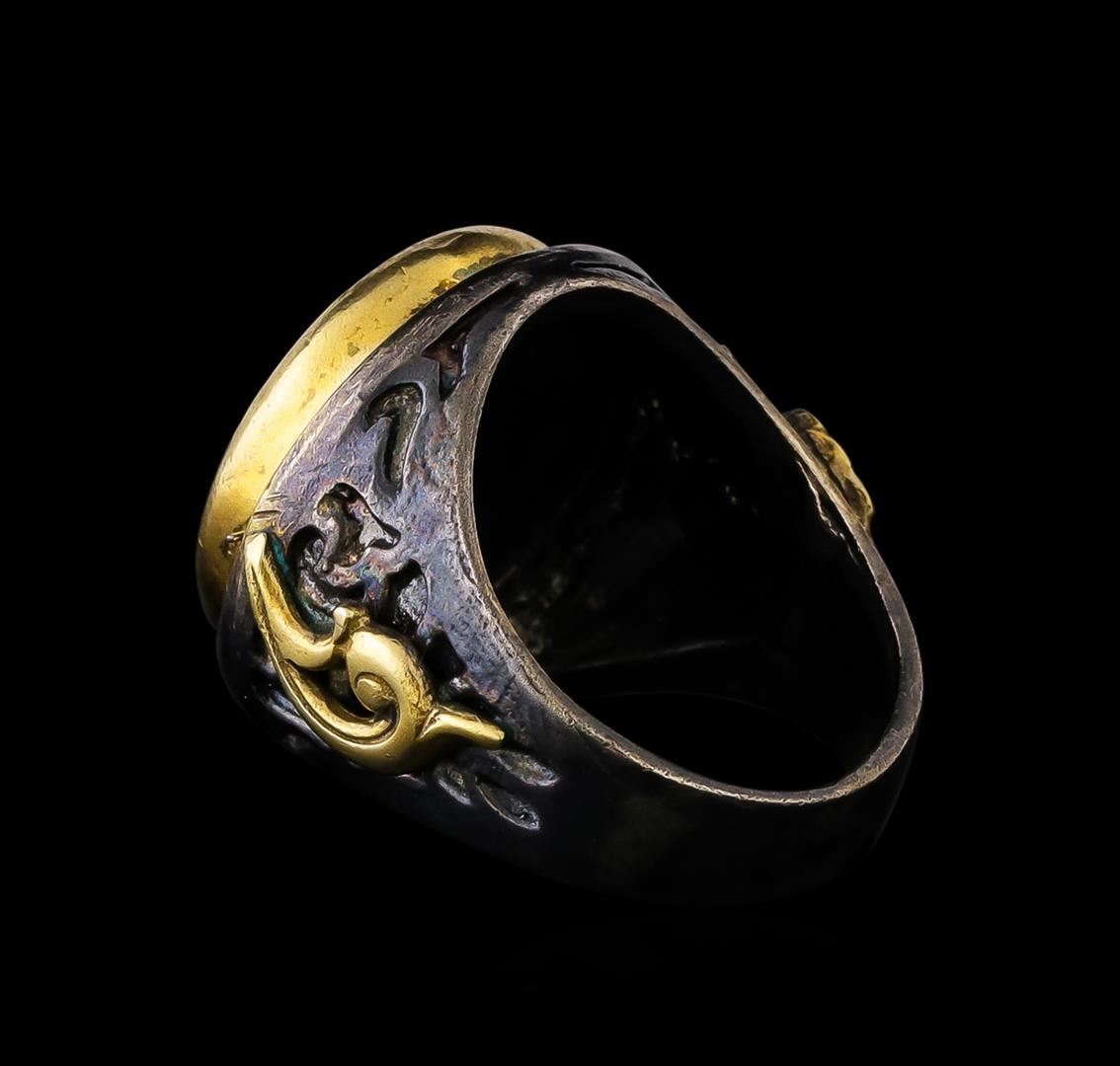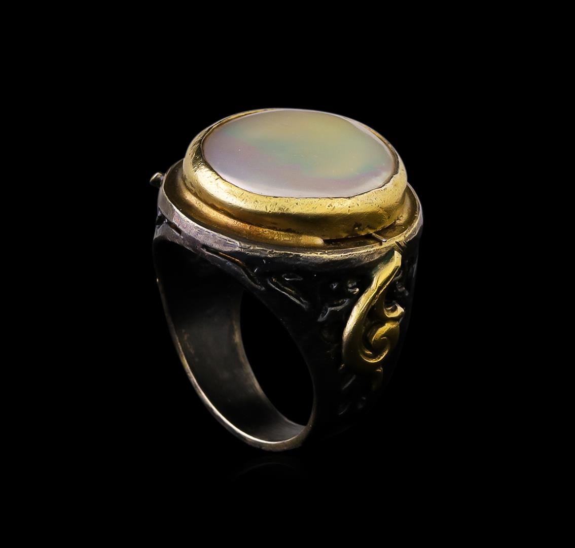 One of a kind high fashion sterling silver Ring weighing 13.3 grams. Black Antique texture. Containing: Pearl. This sterling silver promises a lasting shine.
