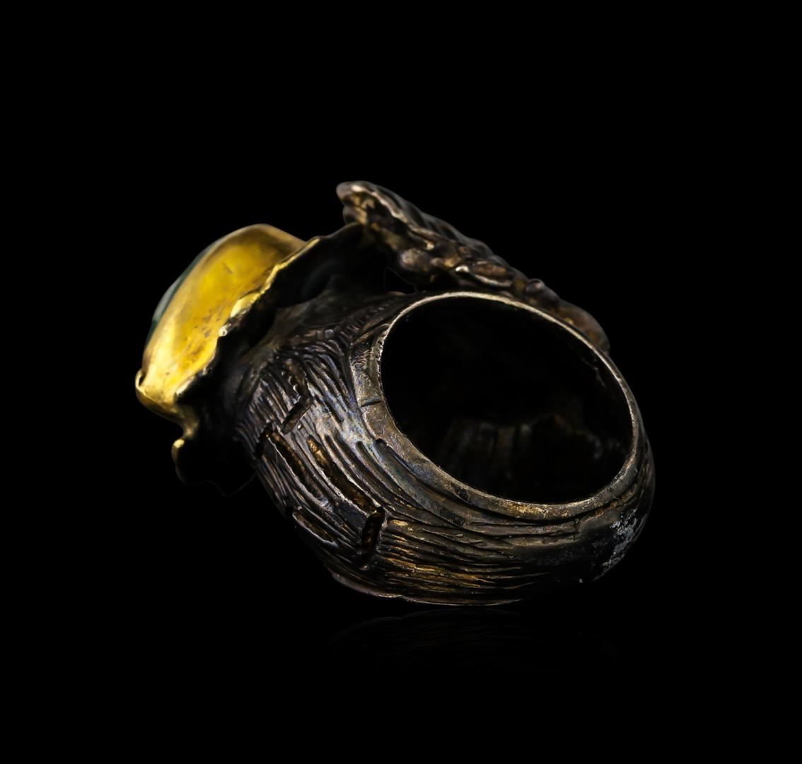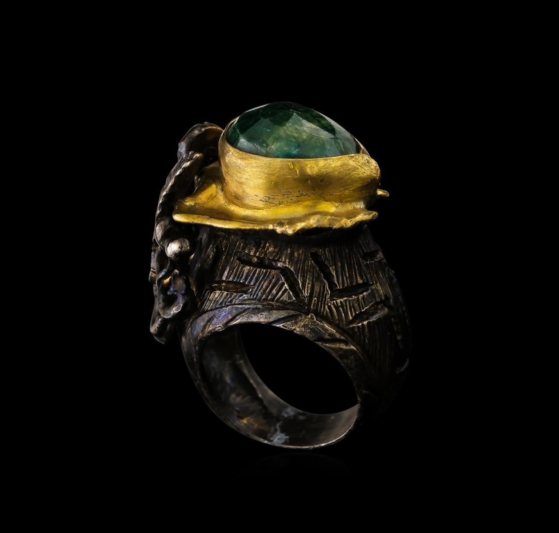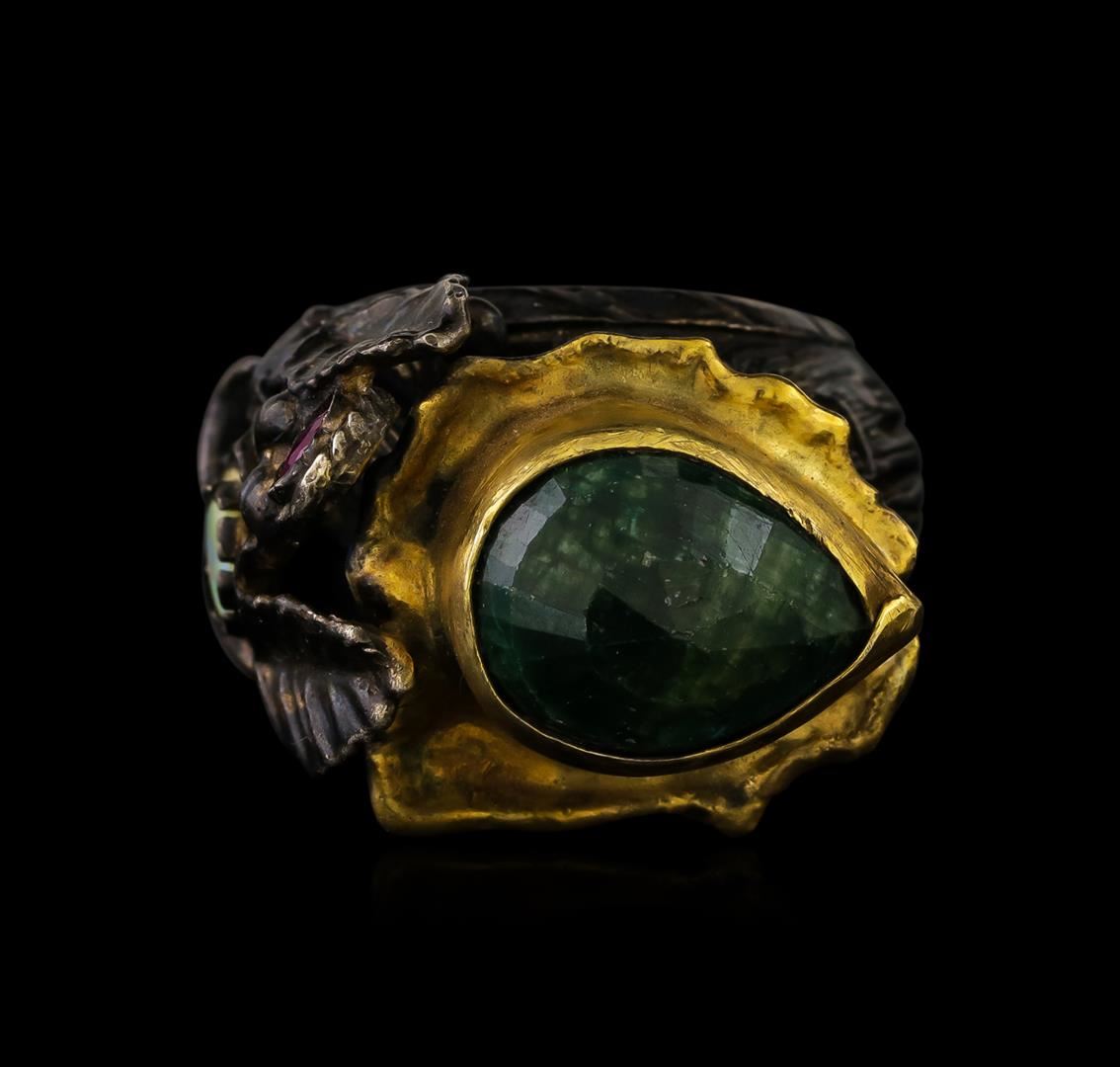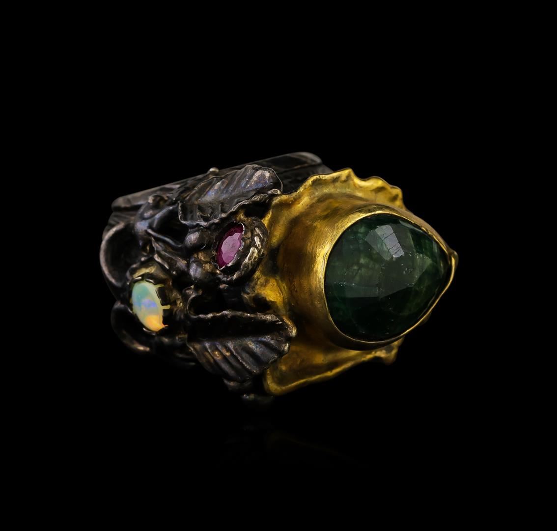 One of a kind high fashion sterling silver Ring weighing 24.8 grams. Black Antique texture. Containing: Green Corundum, Created Ruby, Created Opal. This sterling silver promises a lasting shine.