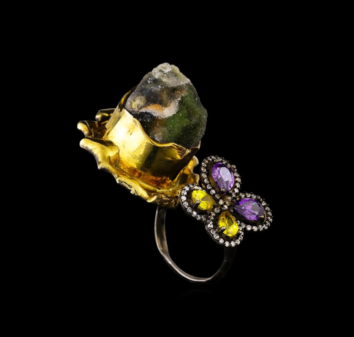 One of a kind high fashion sterling silver Ring weighing 19.9 grams. Black Antique texture. Containing: Crystal Green Lace Agate, White Crystal, Purple Crystal, Yellow Crystal. This sterling silver promises a lasting shine.