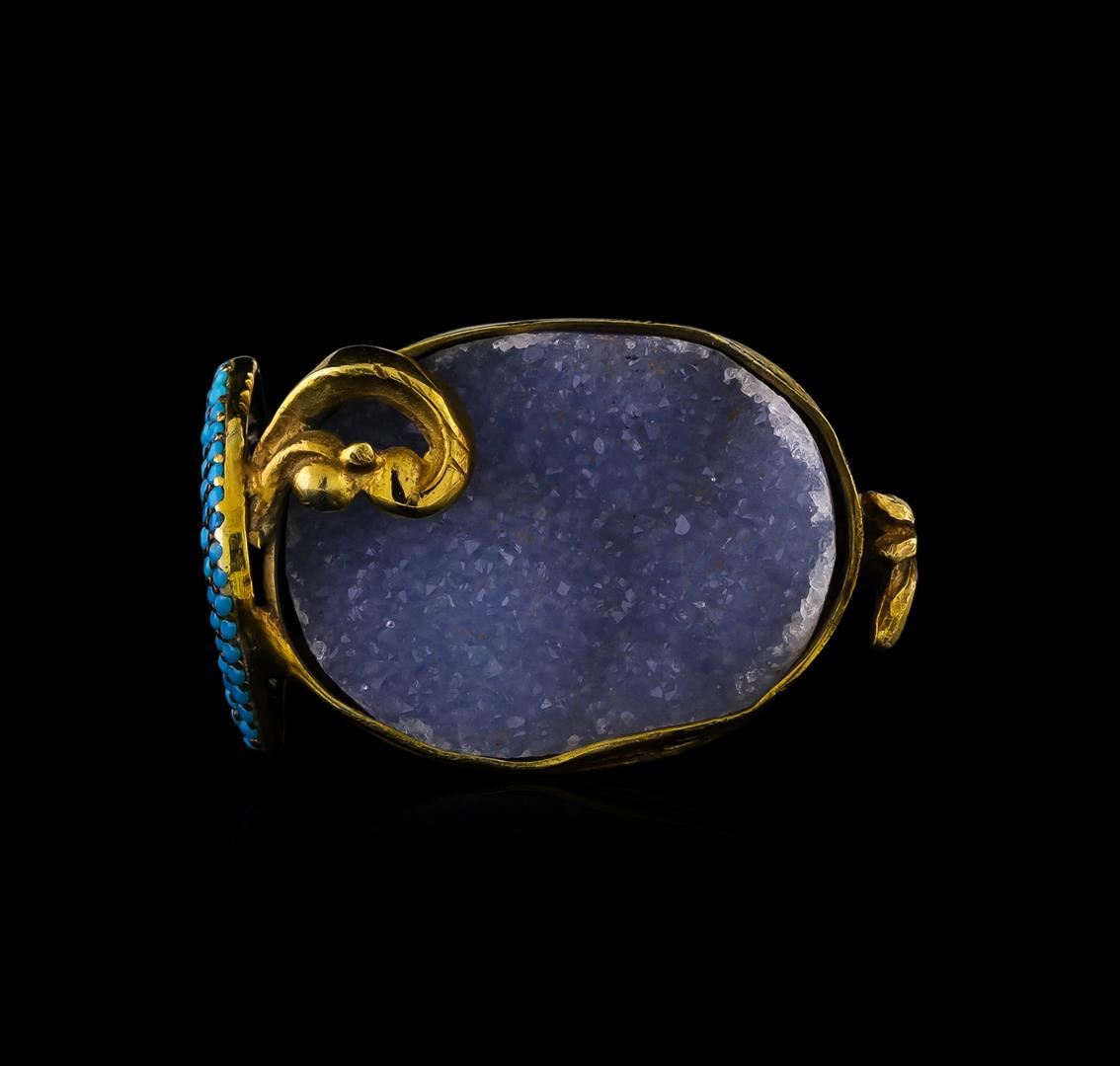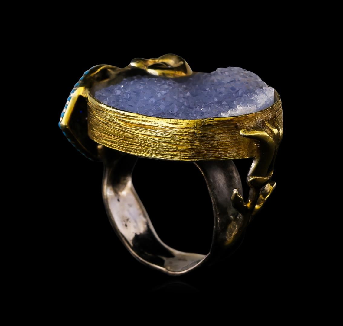 One of a kind high fashion sterling silver Ring weighing 15.9 grams. Black Antique texture. Containing: Crystal Blue Lace Agate, White Crystal, Blue Crystal, Yellowish Green Crystal, Created Turquoise. This sterling silver promises a lasting shine.