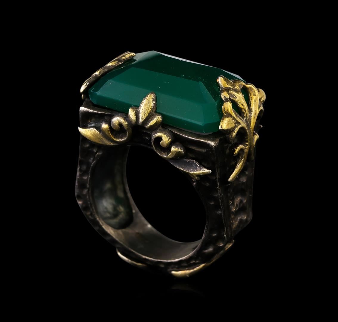 One of a kind high fashion sterling silver Ring weighing 18.7 grams. Black Antique texture. Containing: Green Crystal. This sterling silver promises a lasting shine.