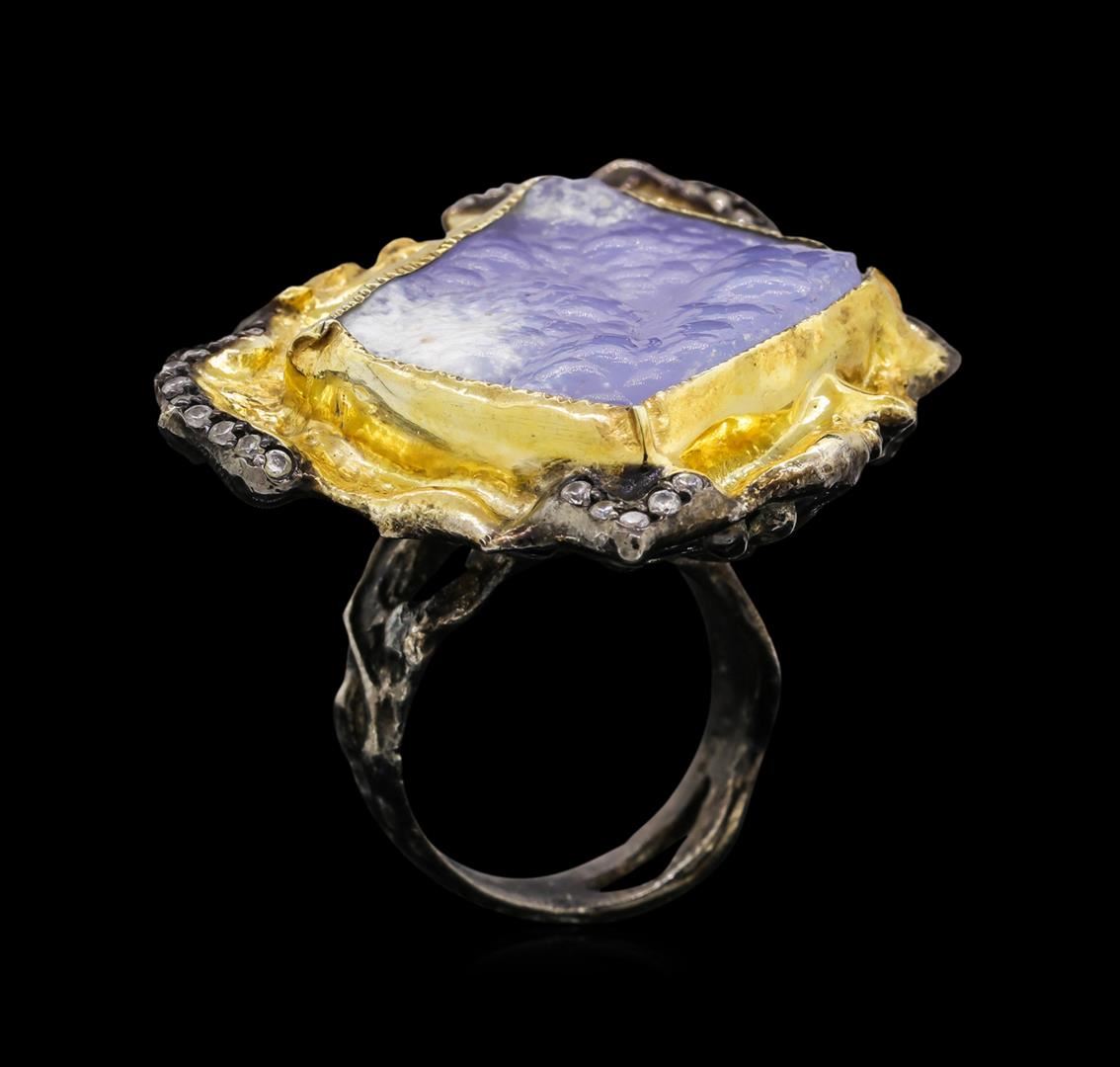One of a kind high fashion sterling silver Ring weighing 35.6 grams. Black Antique texture. Containing: Blue Lace Agate, White Crystal. This sterling silver promises a lasting shine.