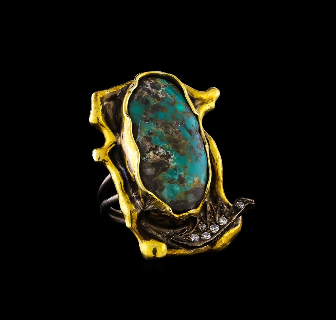 One of a kind high fashion sterling silver Ring weighing 19.2 grams. Containing: Turquoise, White Crystal. This sterling silver promises a lasting shine.