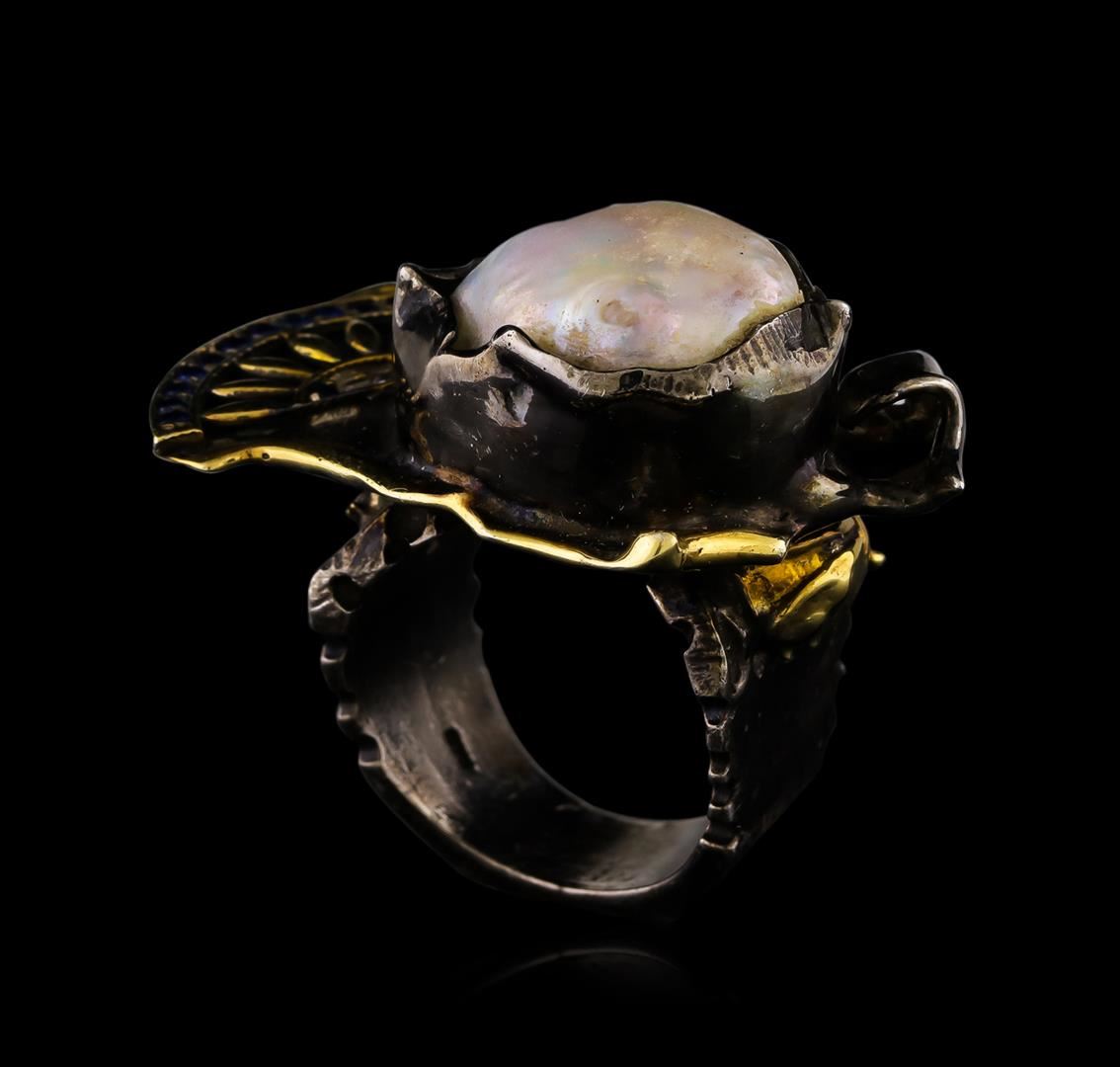One of a kind high fashion sterling silver Ring weighing 31 grams. Black Antique texture. Containing: Natural Pearl, White Crystal, Blue Crystal. This sterling silver promises a lasting shine.