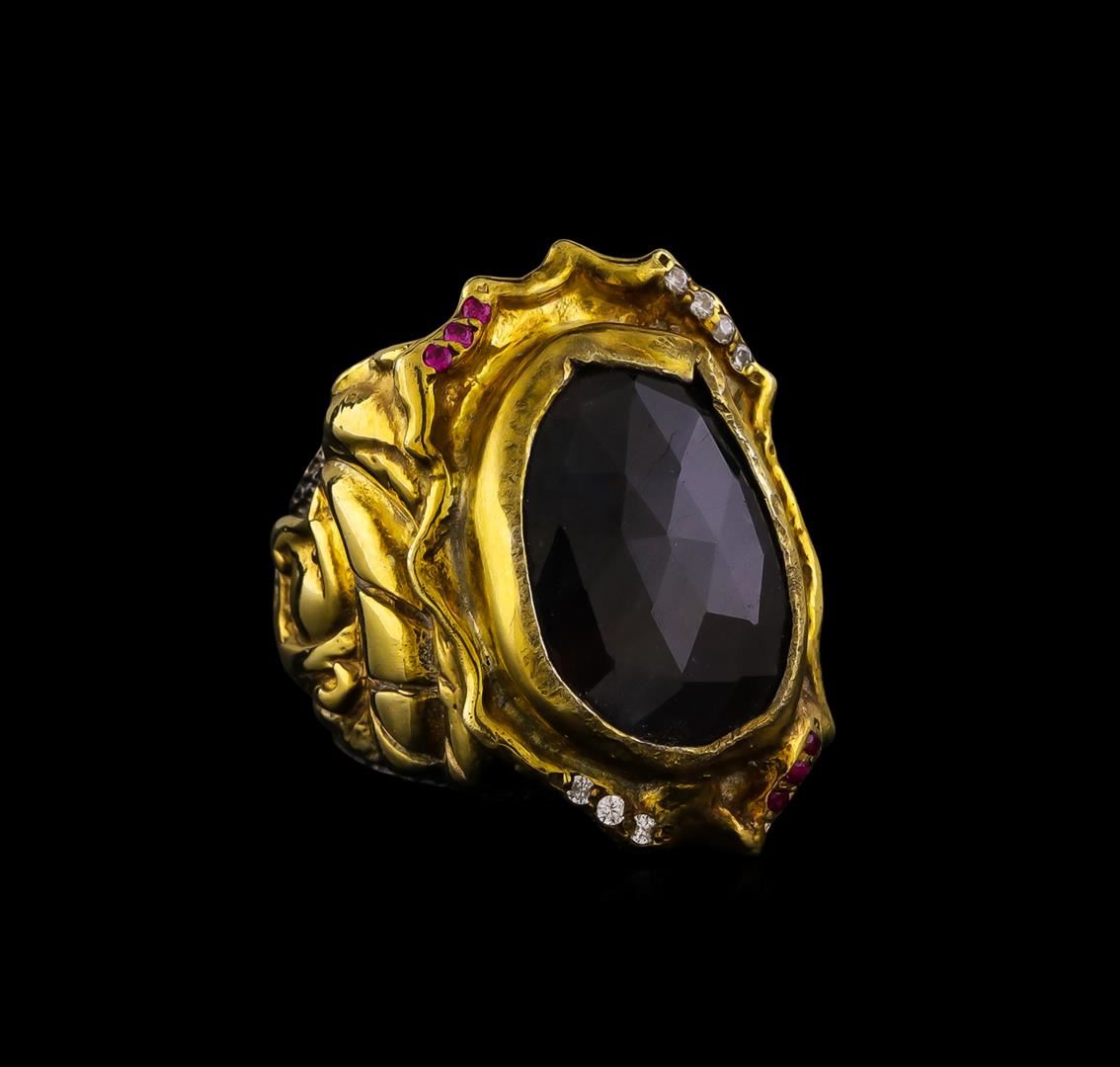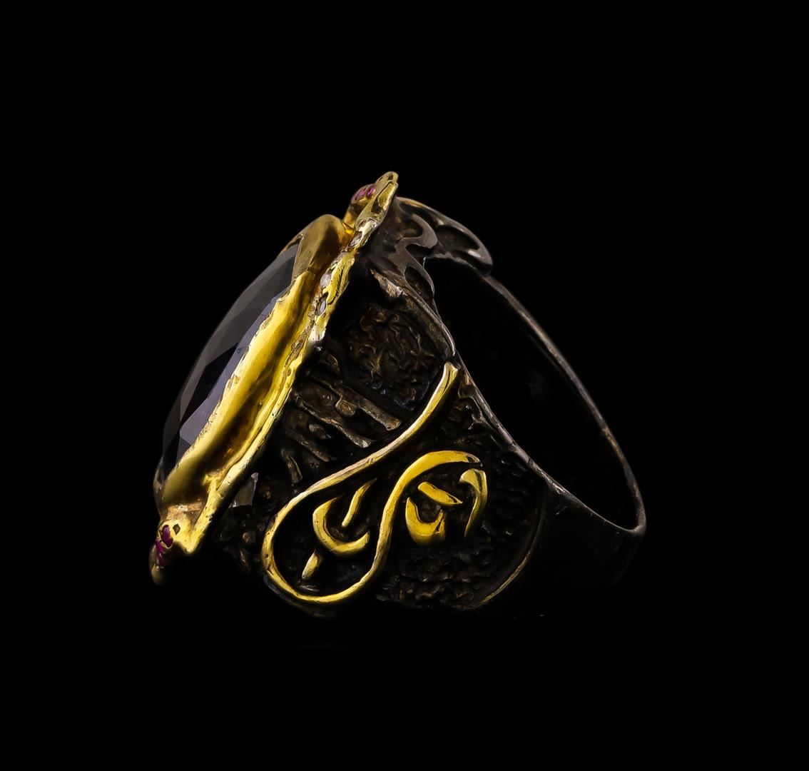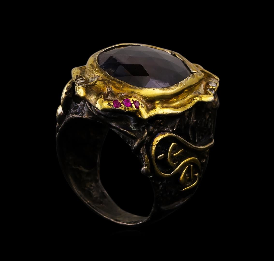 One of a kind high fashion sterling silver Ring weighing 15.7 grams. Containing: Corundum, Synthetic Ruby, White Crystal. This sterling silver promises a lasting shine.