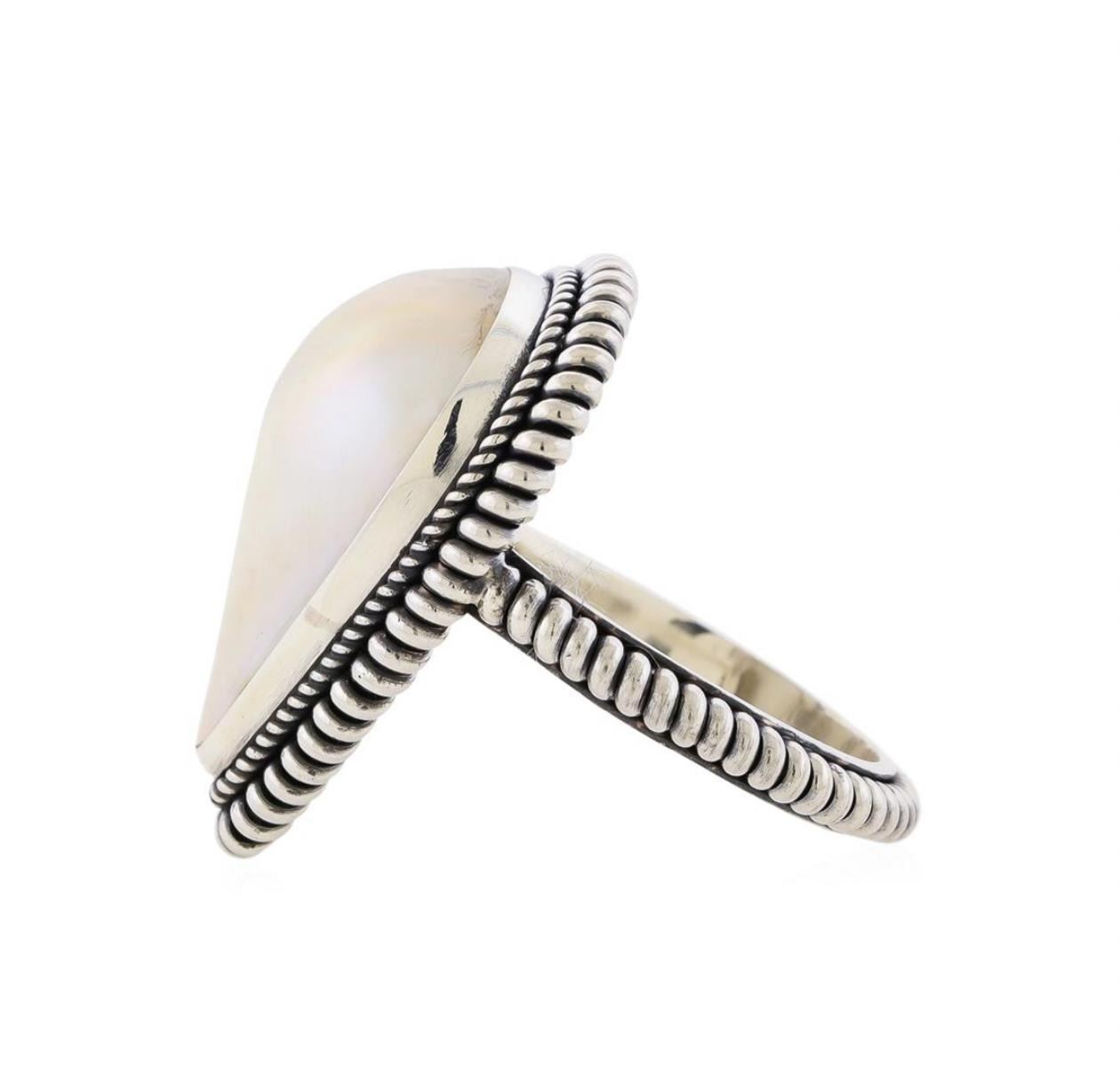 One of a kind high fashion sterling silver Ring weighing 5.5 grams. Containing: Mabe Pearl. This sterling silver promises a lasting shine.