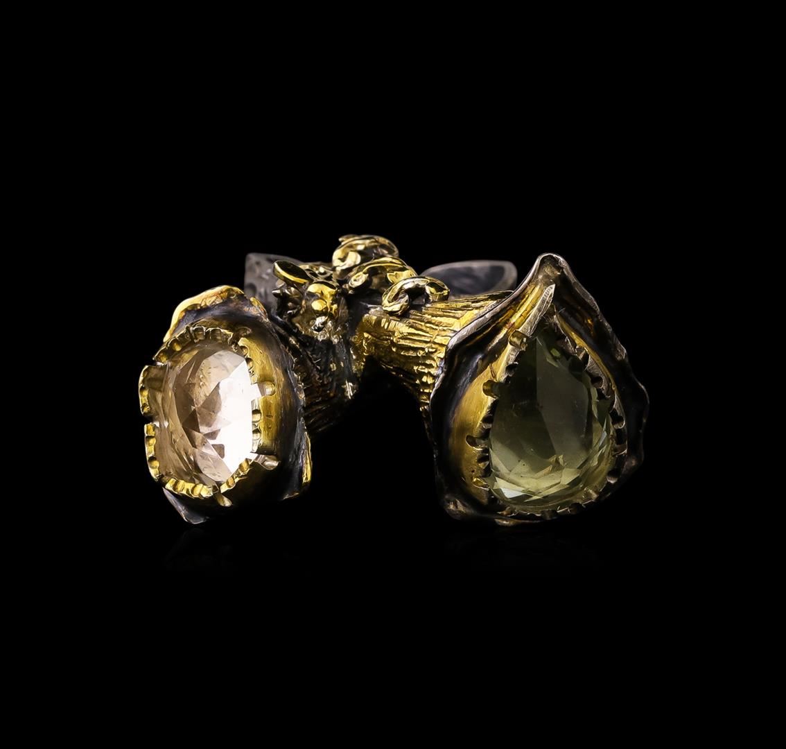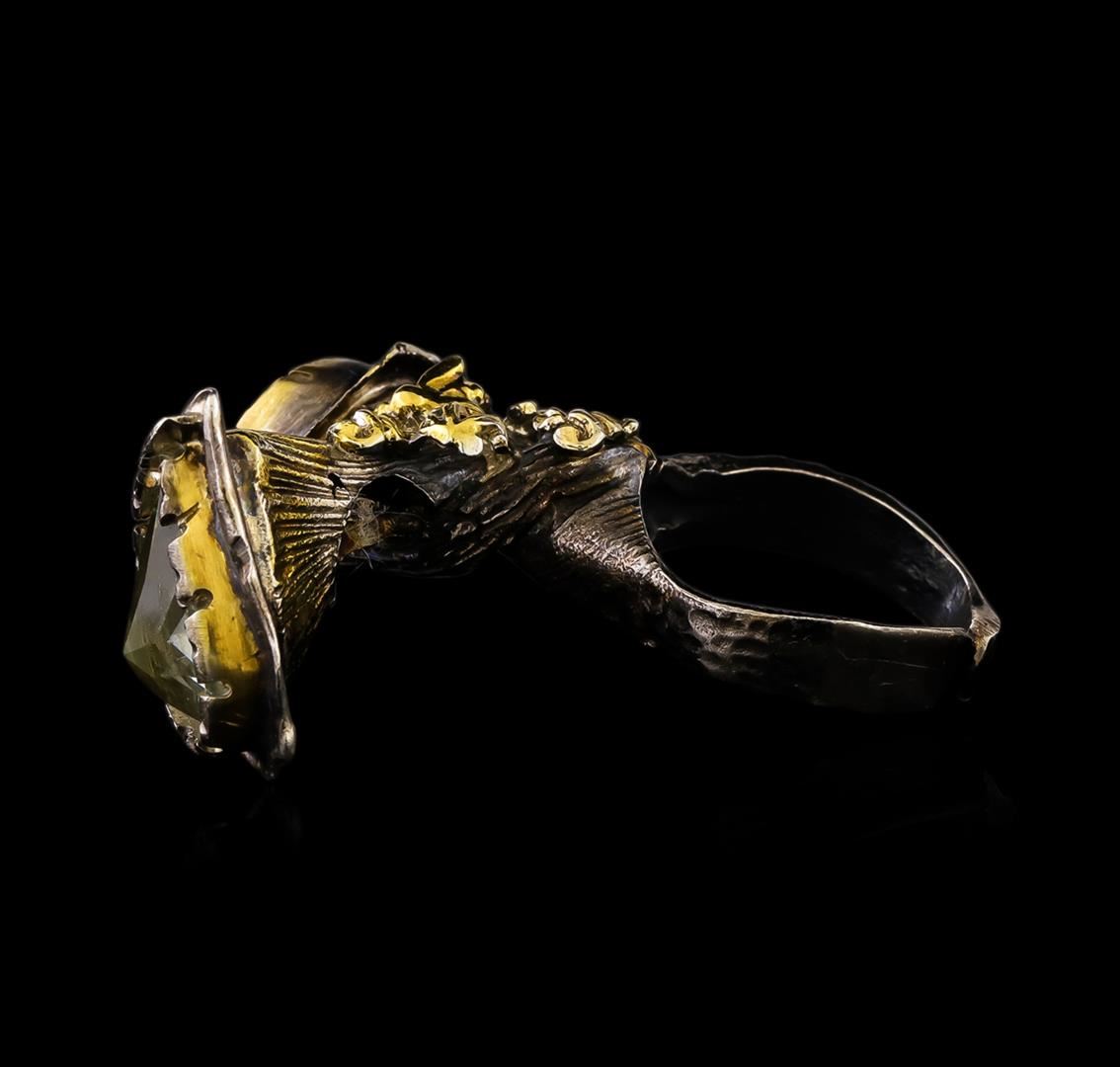 One of a kind high fashion sterling silver Ring weighing 22.6 grams. Black Antique texture. Containing: Peach Quartz, Green Quartz. This sterling silver promises a lasting shine.
