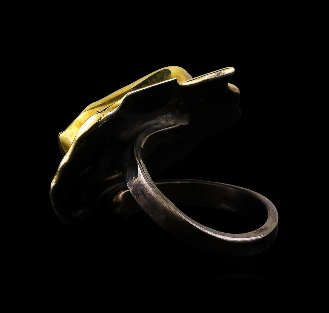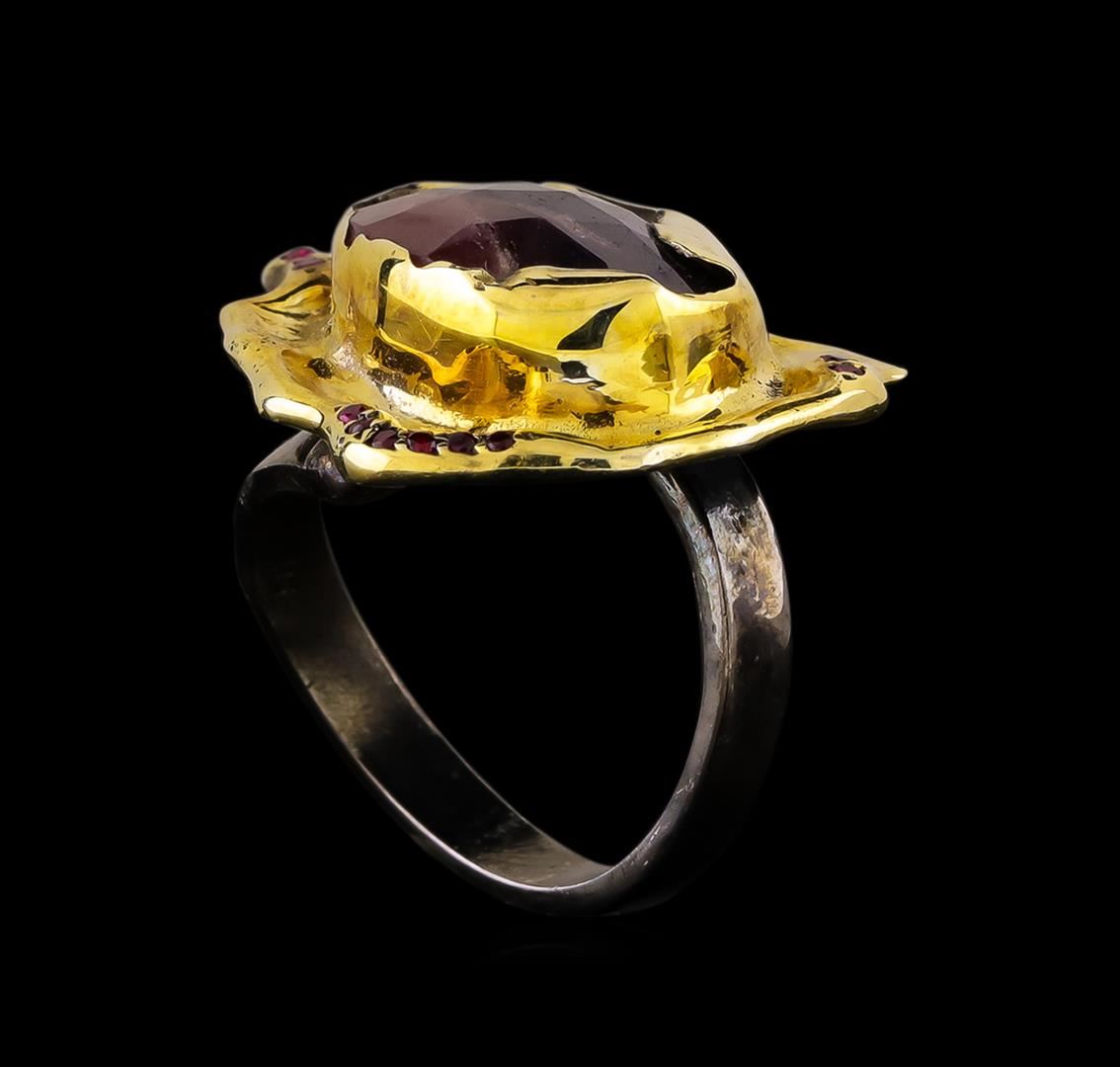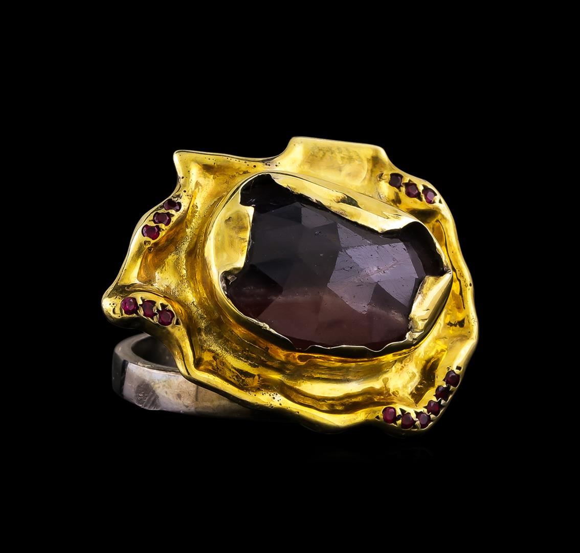 One of a kind high fashion sterling silver Ring weighing 13.7 grams. Black Antique texture. Containing: Corundum, Synthetic Ruby. This sterling silver promises a lasting shine.