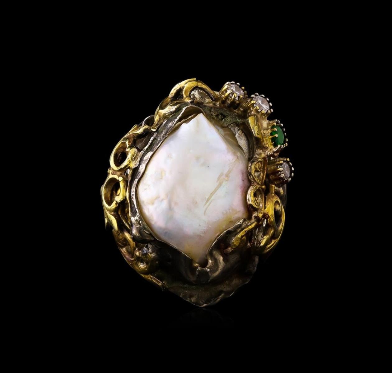One of a kind high fashion sterling silver Ring weighing 38.1 grams. Black Antique texture. Containing: Freshwater Pearl, White Crystal, Green Crystal. This sterling silver promises a lasting shine.