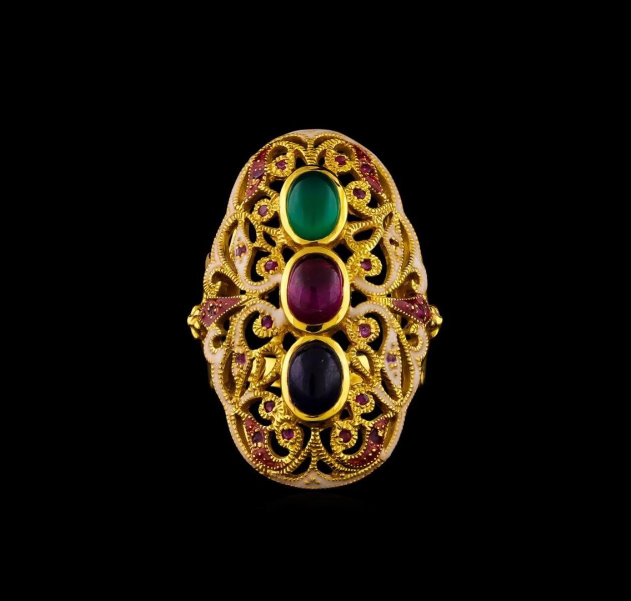 One of a kind high fashion sterling silver Ring weighing 9.2 grams. Containing: Ruby, Emerald, Sapphire, Red Enamel Inlay, White Enamel Inlay. This sterling silver promises a lasting shine.