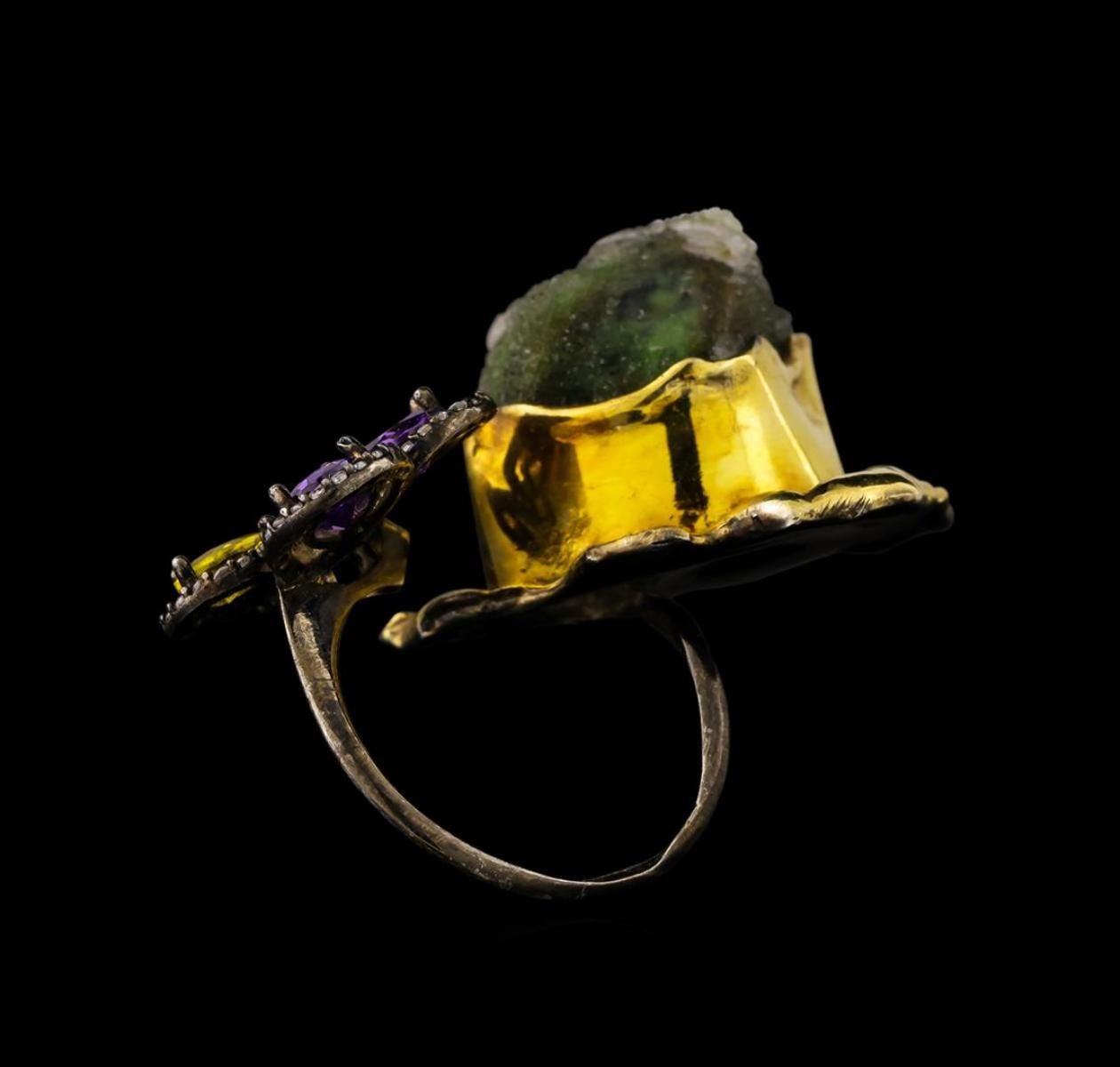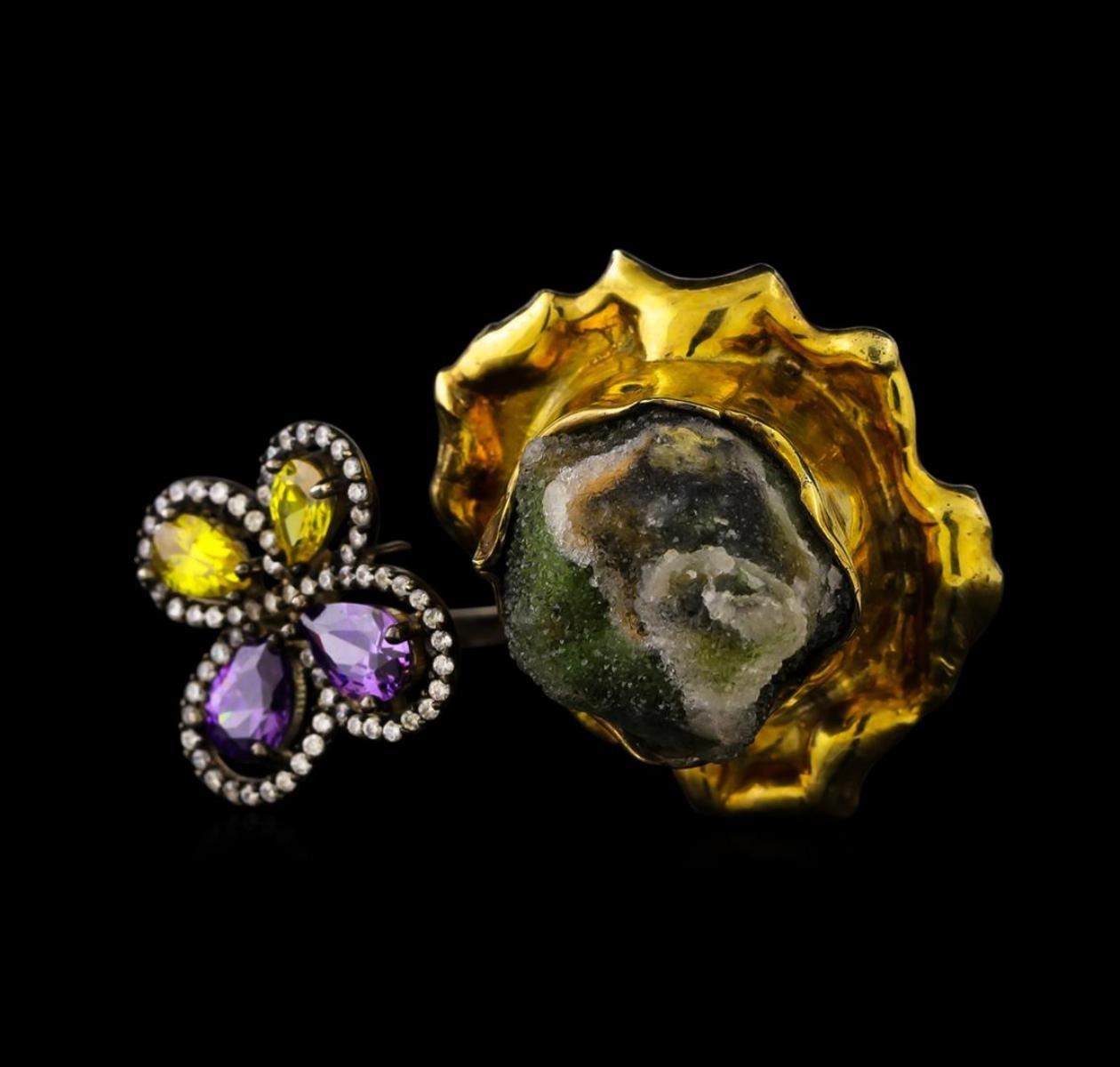 One of a kind high fashion sterling silver Ring weighing 19.9 grams. Black Antique texture. Containing: Crystal Green Lace Agate, White Crystal, Purple Crystal, Yellow Crystal. This sterling silver promises a lasting shine.