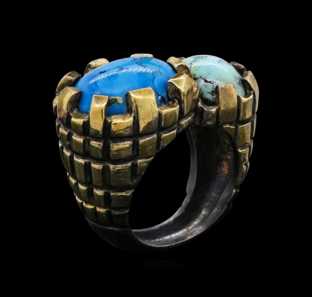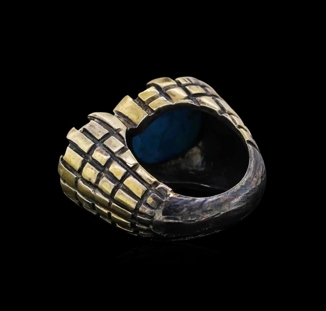 One of a kind high fashion sterling silver Ring weighing 19.6 grams. Black Antique texture. Containing: Treated Turquoise. This sterling silver promises a lasting shine.