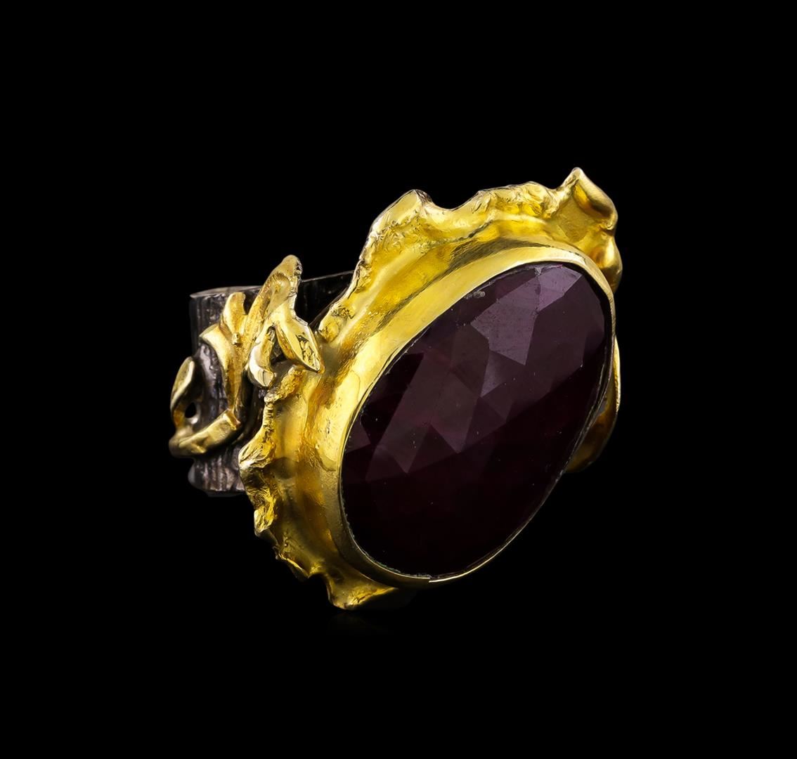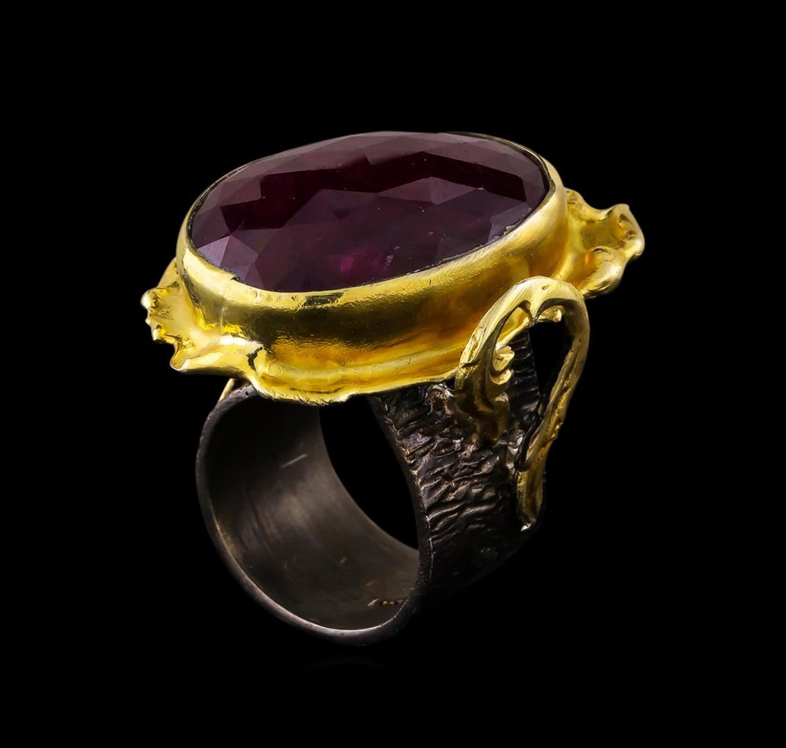 One of a kind high fashion sterling silver Ring weighing 34 grams. Black Antique texture. Containing: Ruby. This sterling silver promises a lasting shine.