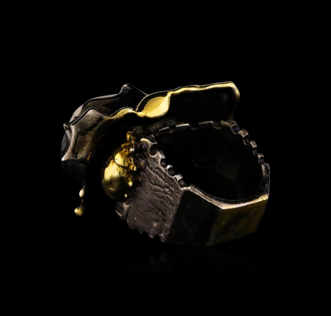 One of a kind high fashion sterling silver Ring weighing 31 grams. Black Antique texture. Containing: Natural Pearl, White Crystal, Blue Crystal. This sterling silver promises a lasting shine.
