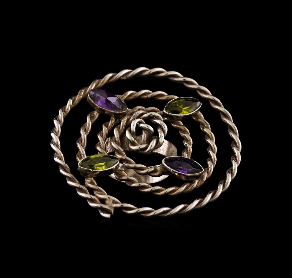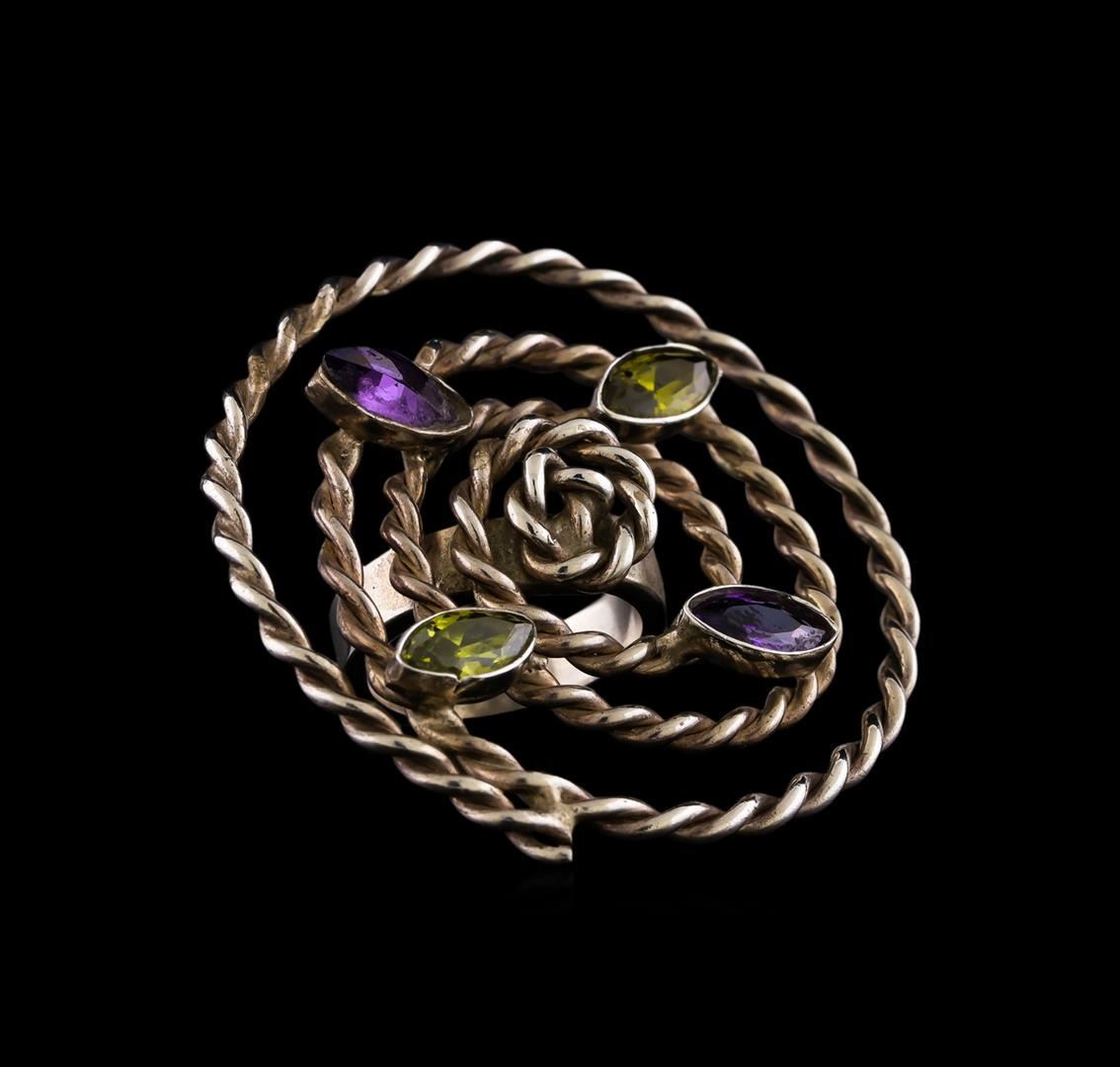 One of a kind high fashion sterling silver Ring weighing 22.9 grams. Containing: Purple Crystal, Yellowish Green Crystal. This sterling silver promises a lasting shine.