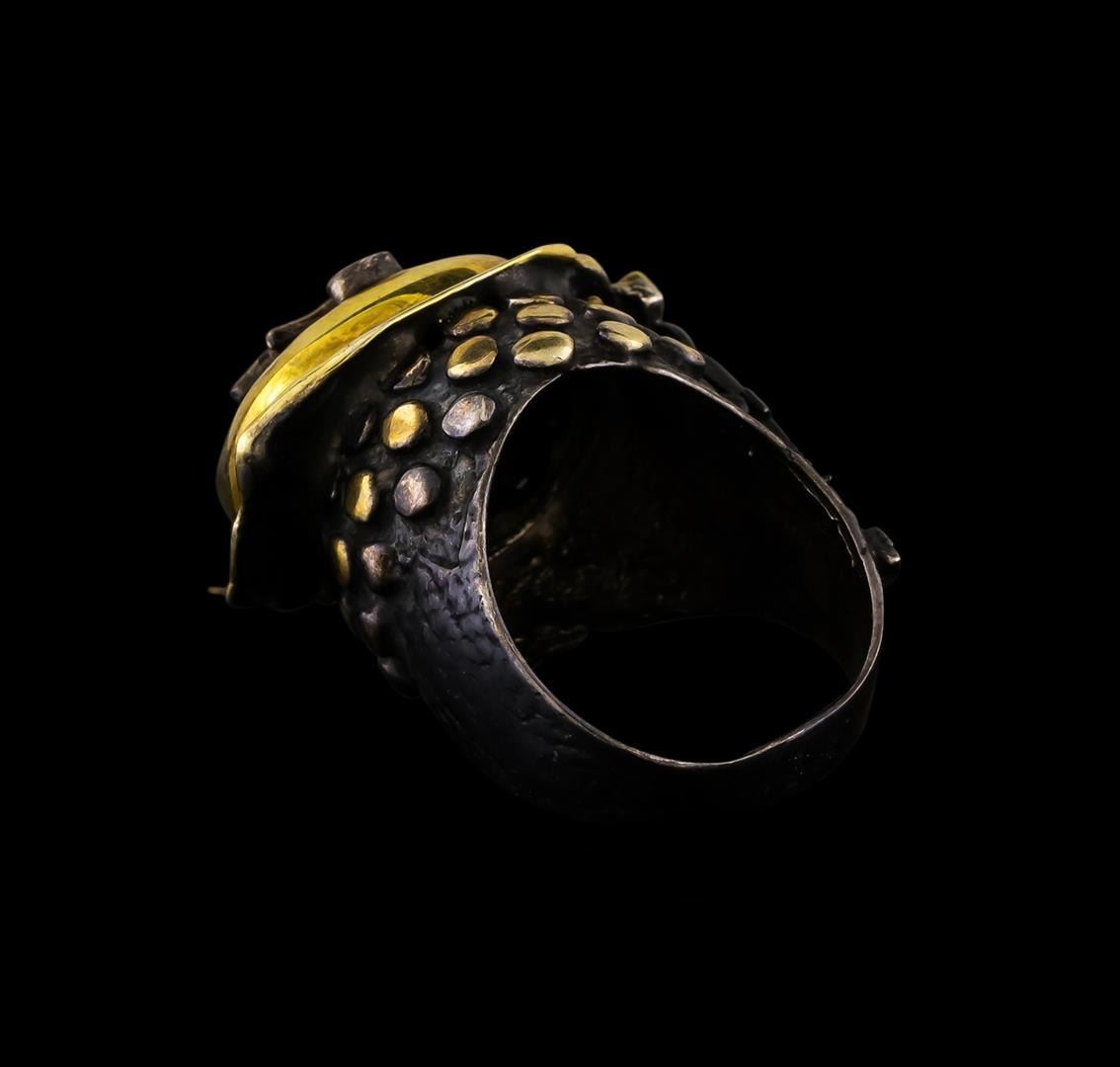 One of a kind high fashion sterling silver Ring weighing 20 grams. Black Antique texture. Containing: Quartz Crystal. This sterling silver promises a lasting shine.