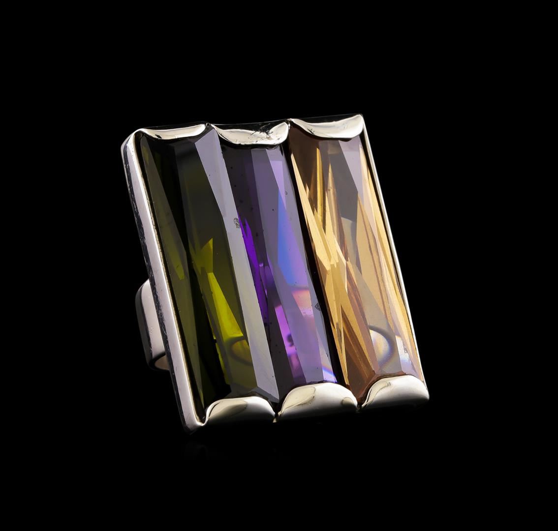 One of a kind high fashion sterling silver Ring weighing 21.3 grams. Containing: Peach Crystal, Purple Crystal, Dark Green Crystal. This sterling silver promises a lasting shine.